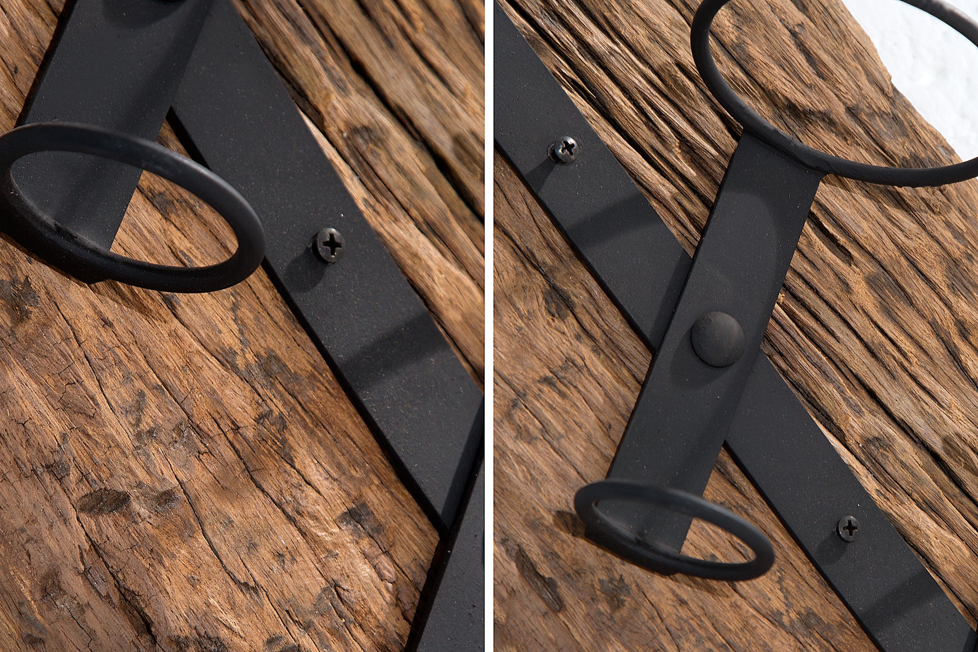 Największym wyróżnikiem jest surowy, naturalny wygląd drewna. Tek pochodzi często z odzysku (np. stare łodzie, pomosty), dlatego ma wyraźne pęknięcia, nierówności i unikalne usłojenie – każdy egzemplarz wygląda inaczej.