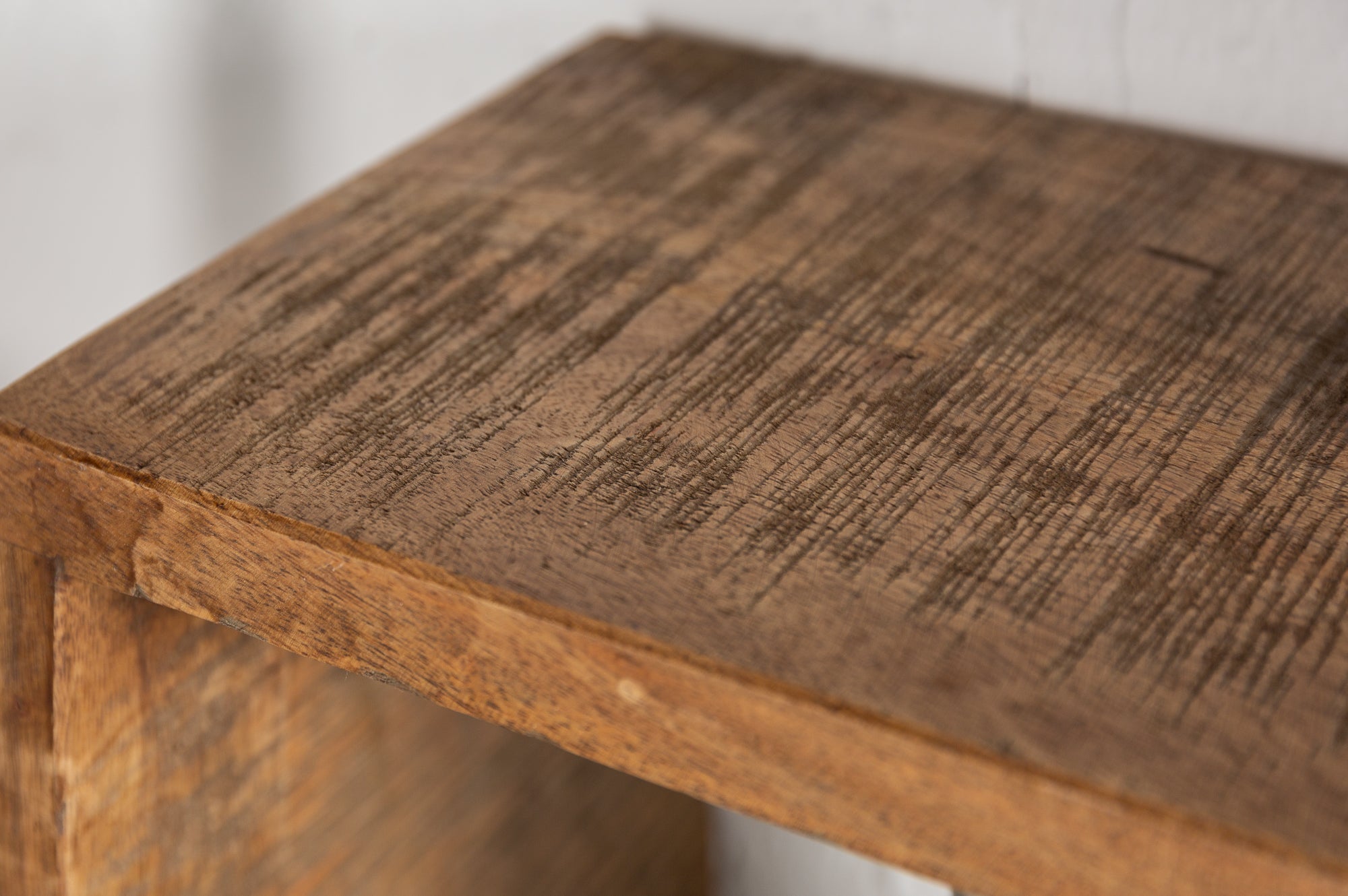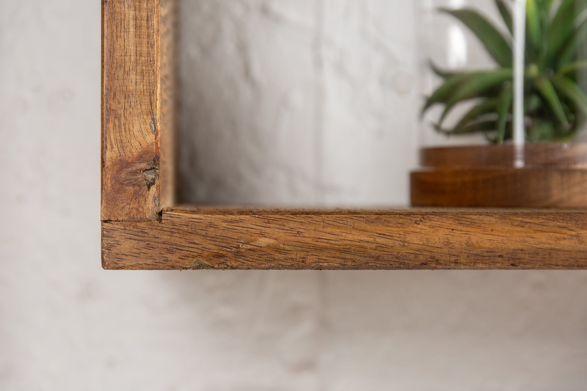 Najbardziej charakterystycznym elementem zestawu jest jego modułowa forma – trzy półki o różnych rozmiarach można dowolnie rozmieszczać na ścianie, zarówno poziomo, jak i pionowo. Dzięki temu łatwo dopasować układ do własnej przestrzeni i stworzyć unikalną aranżację. Naturalne drewno z widocznymi sękami, przetarciami i nierównościami sprawia, że każda sztuka jest niepowtarzalna