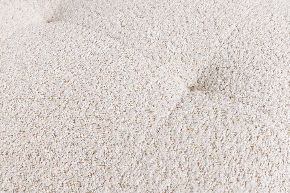 Tapicerka wykonana jest z tkaniny bouclé (100% poliester) – miękkiej, przyjemnej w dotyku i bardzo modnej. Charakterystyczna struktura materiału nadaje pufie efekt „premium” i sprawia, że świetnie komponuje się z nowoczesnymi aranżacjami.