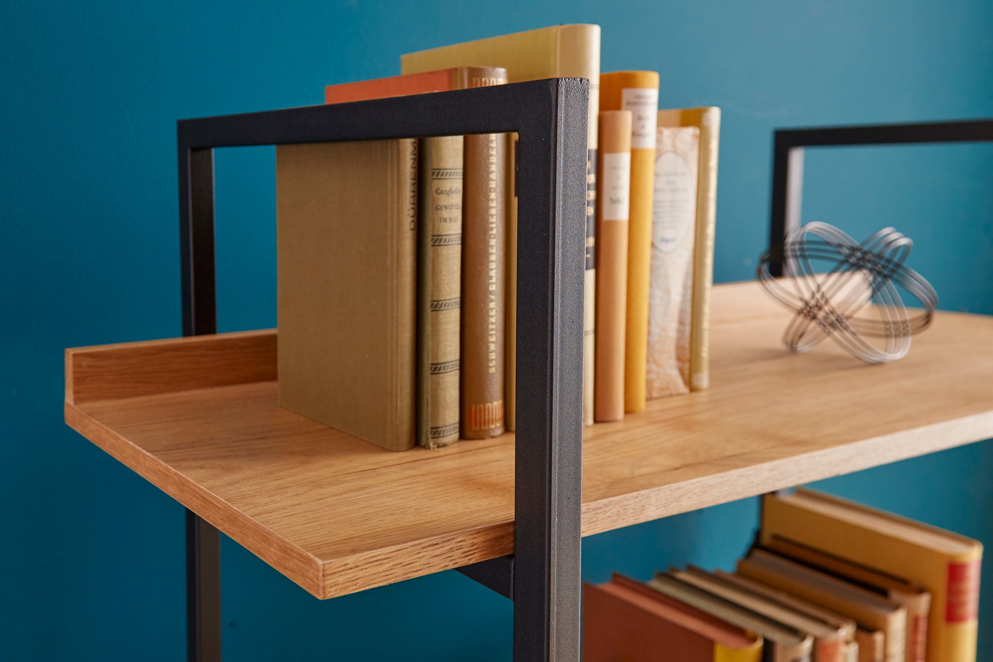 Konstrukcja oparta jest na stabilnym stelażu z metalu, który nadaje całości surowy charakter i zapewnia trwałość. Półki wykonane są z płyty MDF z okleiną imitującą naturalne drewno dębowe, co pozwala uzyskać efekt drewna przy zachowaniu dobrej odporności na codzienne użytkowanie
