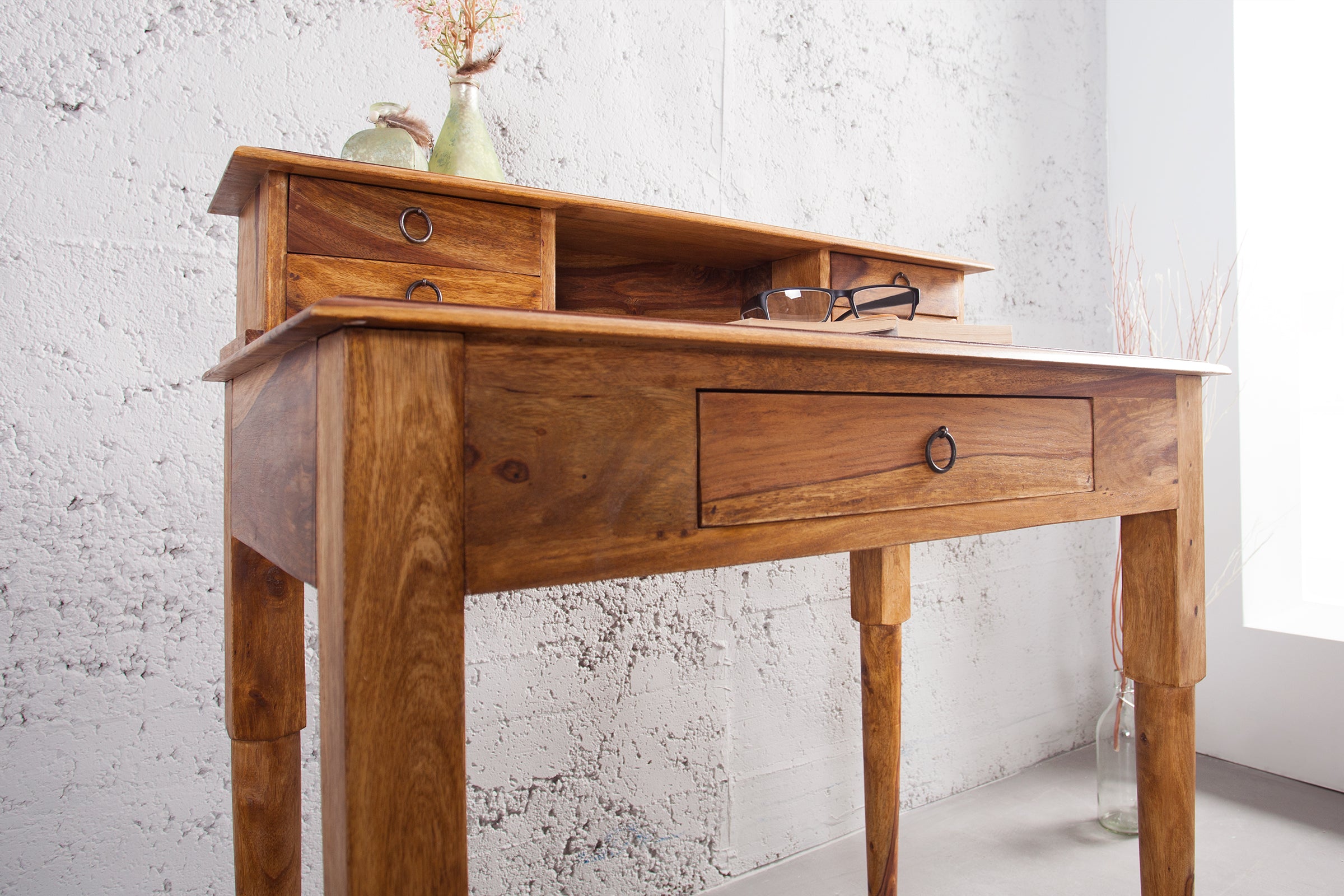 Eleganckie biurko typu davenport, które łączy klasyczny styl z funkcjonalnością codziennego użytkowania. Wykonane z litego drewna sheesham, wyróżnia się ciepłą kolorystyką oraz naturalnym usłojeniem, dzięki czemu każdy egzemplarz ma indywidualny charakter.