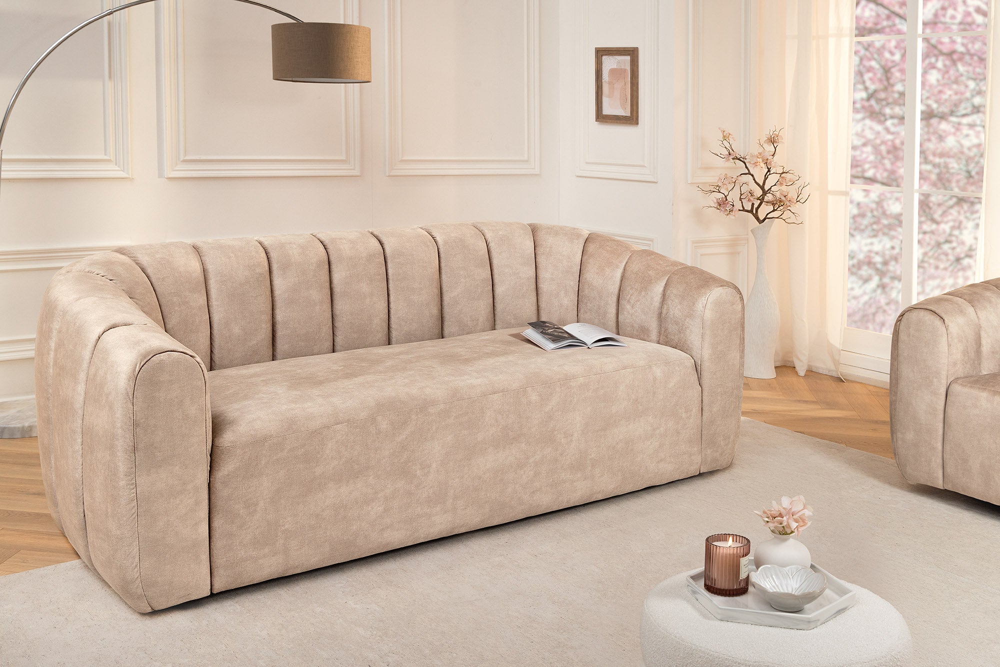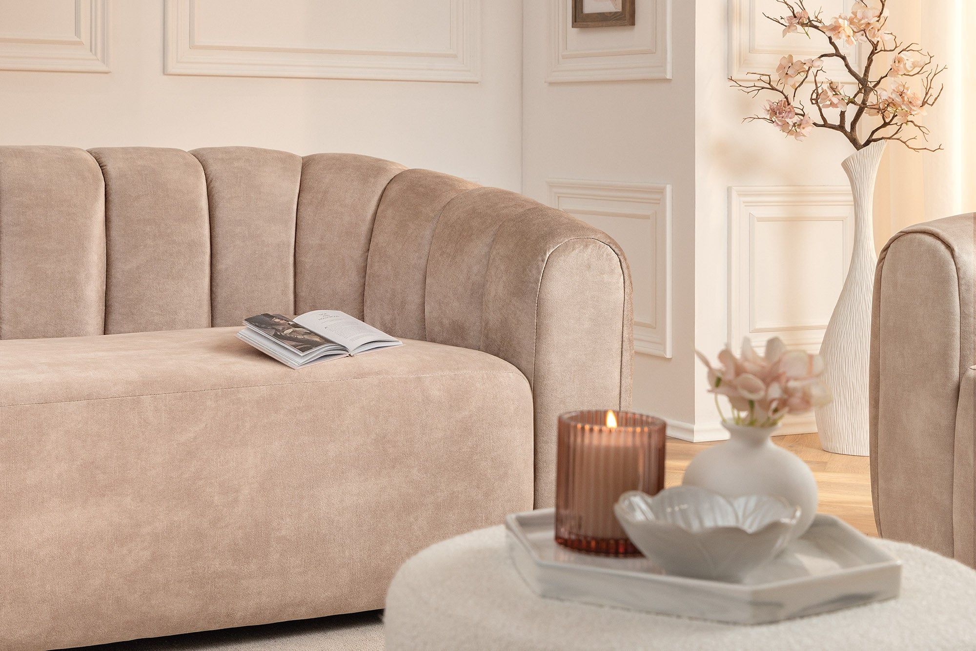 Sofa BABYLON to elegancki, 3-osobowy model wypoczynkowy o nowoczesnej i przytulnej formie. Beżowa tapicerka z miękkiego weluru nadaje jej subtelny, luksusowy charakter, a prosta sylwetka sprawia, że sofa dobrze odnajdzie się w wielu aranżacjach salonu.