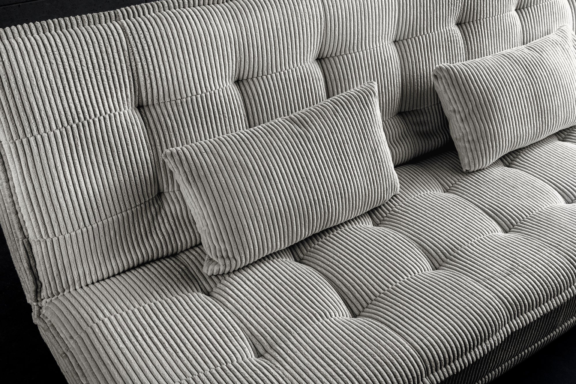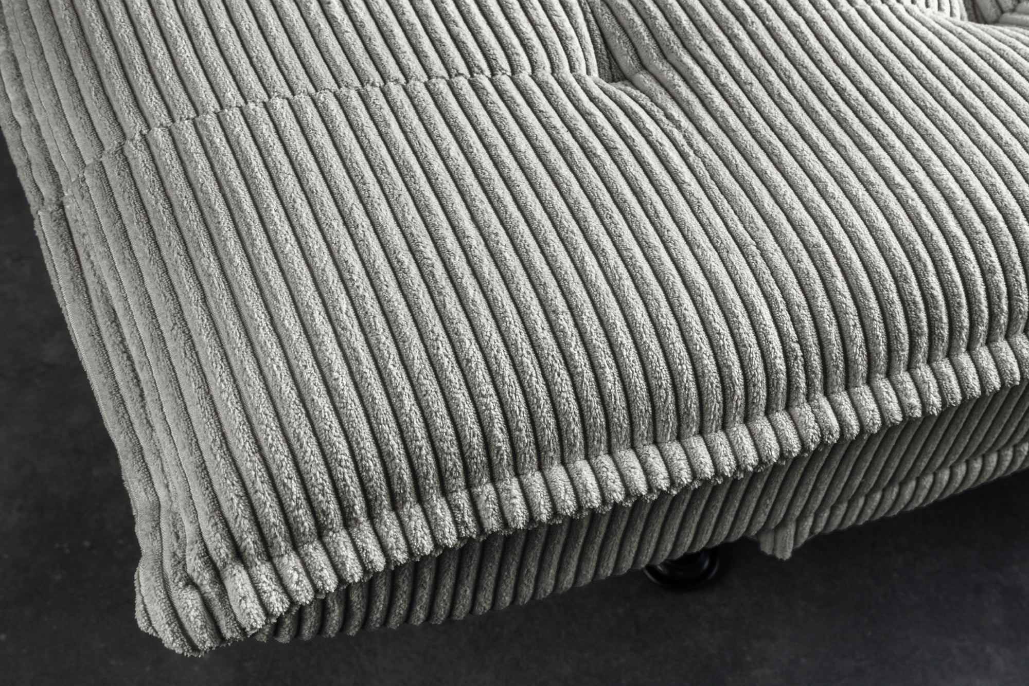 Najbardziej charakterystycznym elementem mebla jest tapicerka typu cord (sztruks) o wyraźnej strukturze. Materiał jest miękki, przyjemny w dotyku i odporny na codzienne użytkowanie, dzięki czemu sofa sprawdzi się zarówno w salonie, jak i w mieszkaniu na wynajem.
