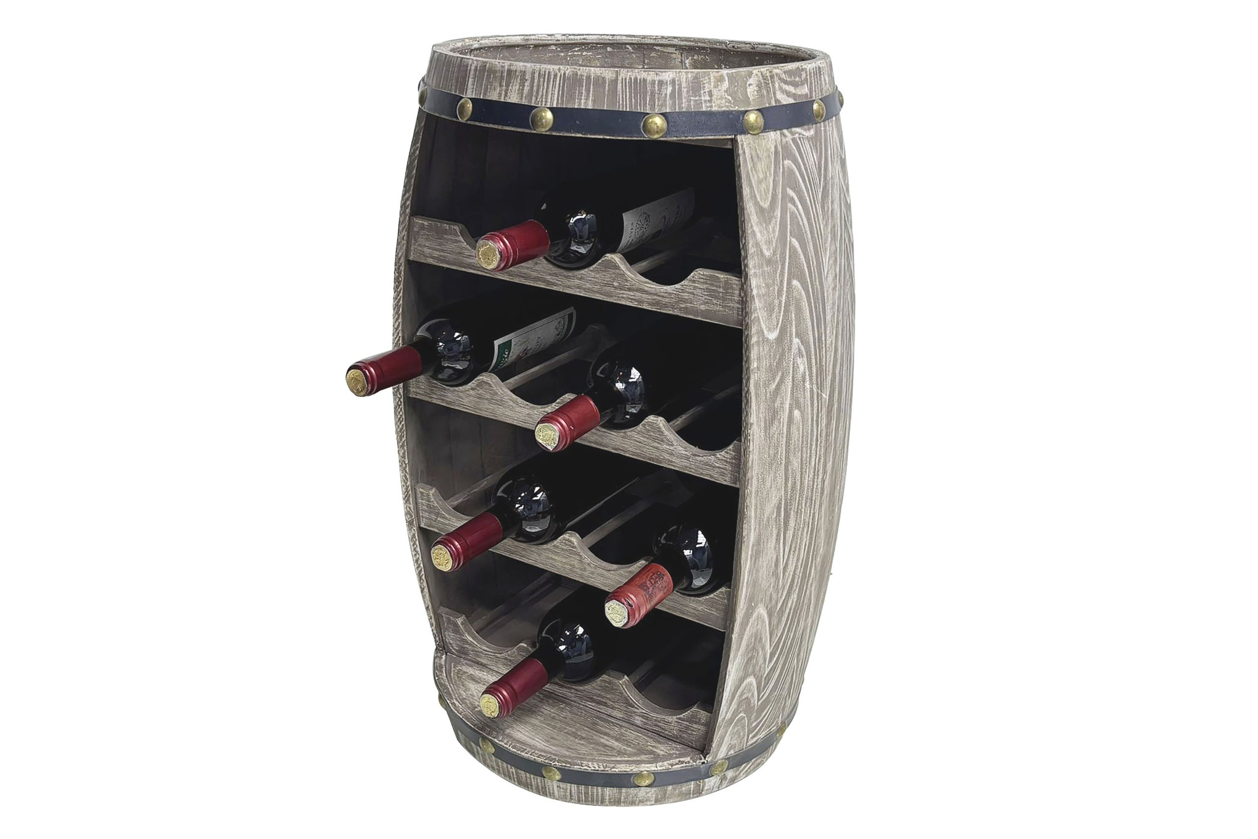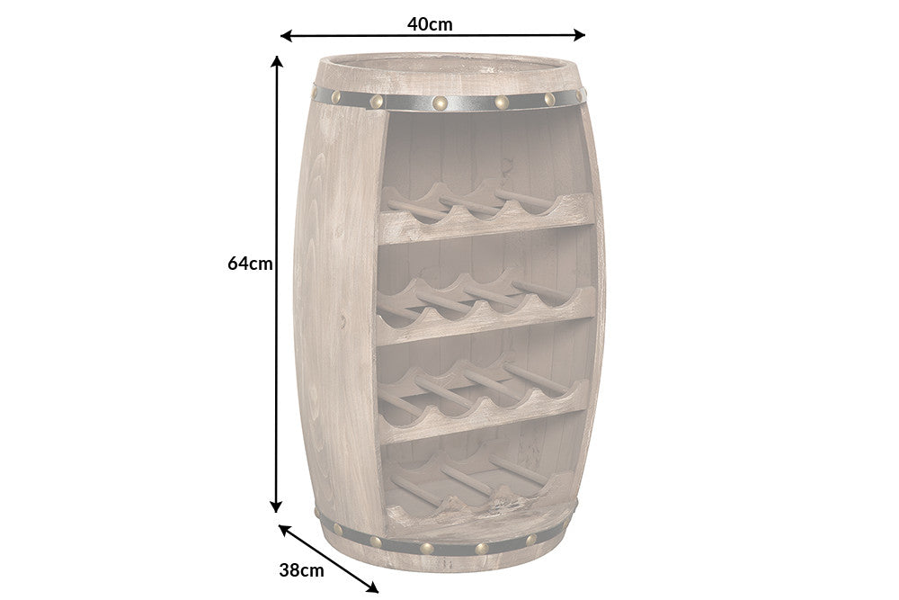 Forma inspirowana jest połową beczki, co nadaje mu wyjątkowego klimatu i sprawia, że nie jest to zwykły regał na wino, tylko element aranżacji wnętrza. Widoczne sęki, nierówności i celowe „postarzenia” są zamierzonym efektem stylistycznym, podkreślającym jego autentyczny charakter.