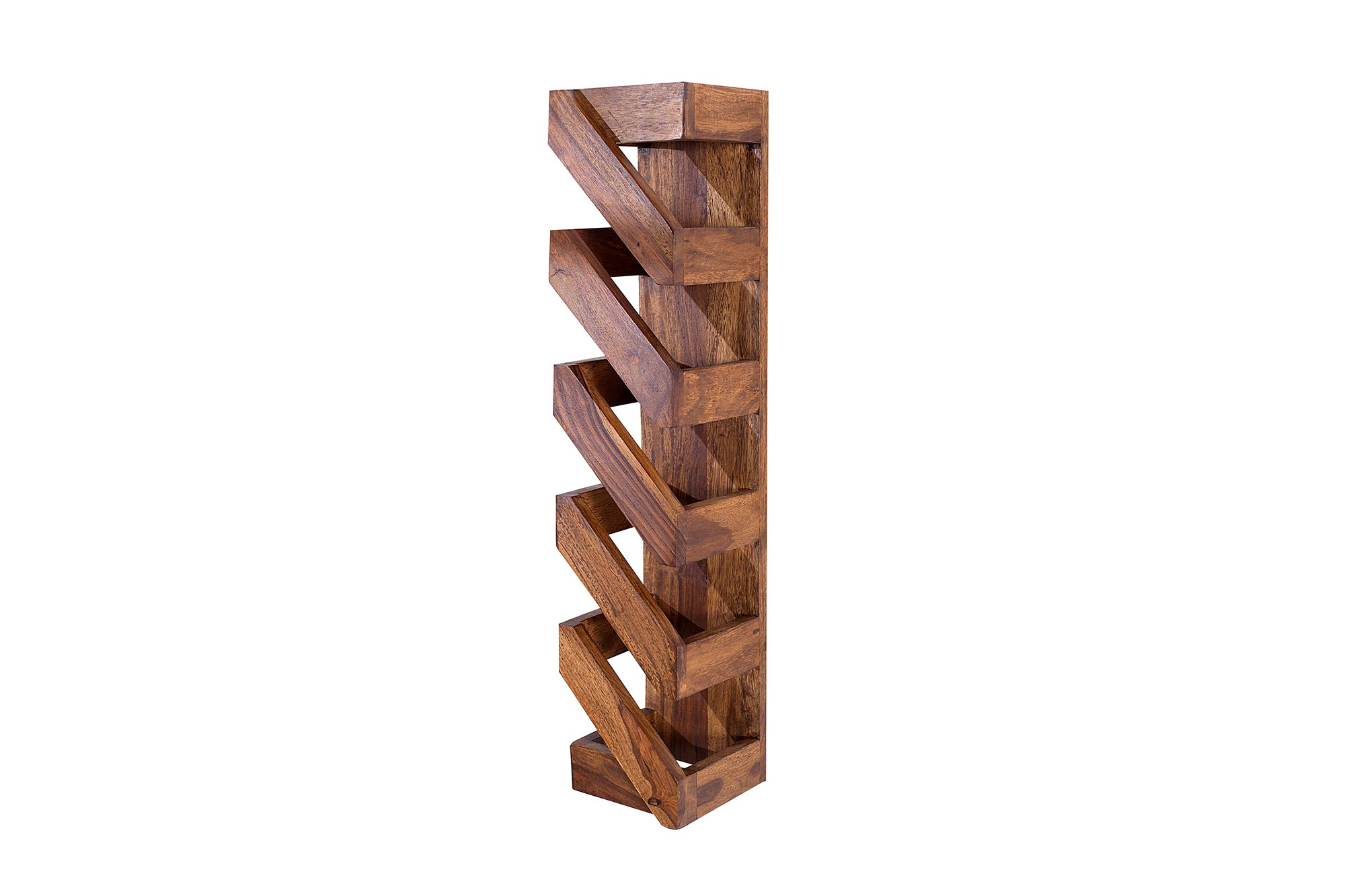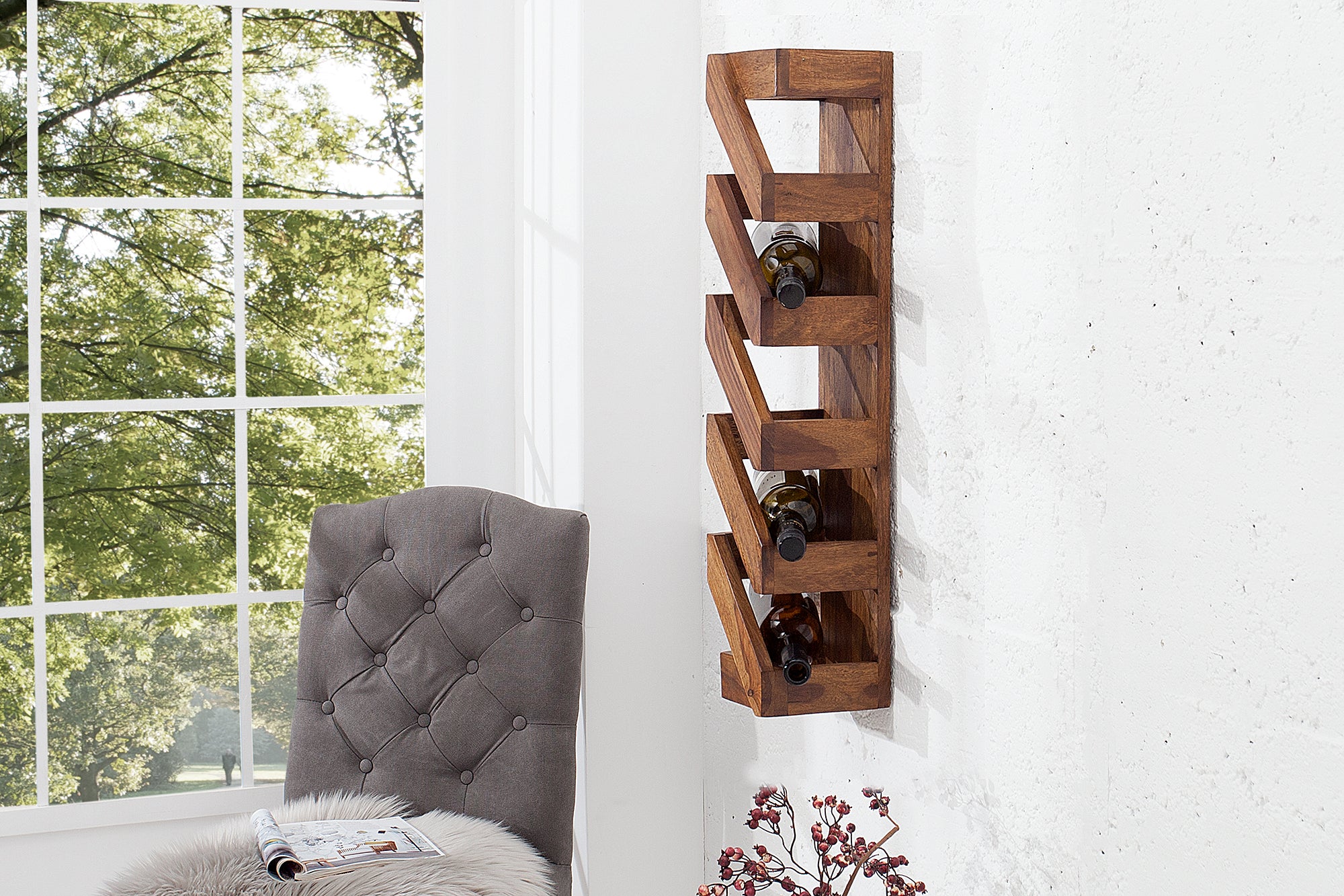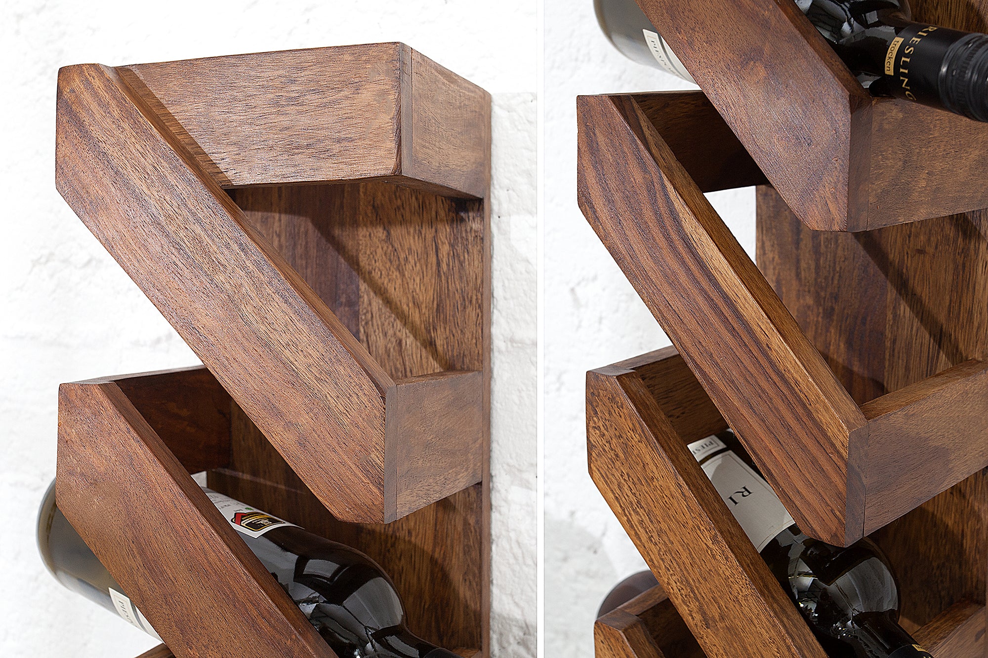 Stojak na wino MAKASSAR 70 cm to kompaktowy, ale bardzo stylowy element wyposażenia, który łączy funkcję przechowywania z dekoracyjnym wyglądem. Wykonany z litego drewna sheesham, wyróżnia się wyraźnym usłojeniem i naturalnym, eleganckim wykończeniem.