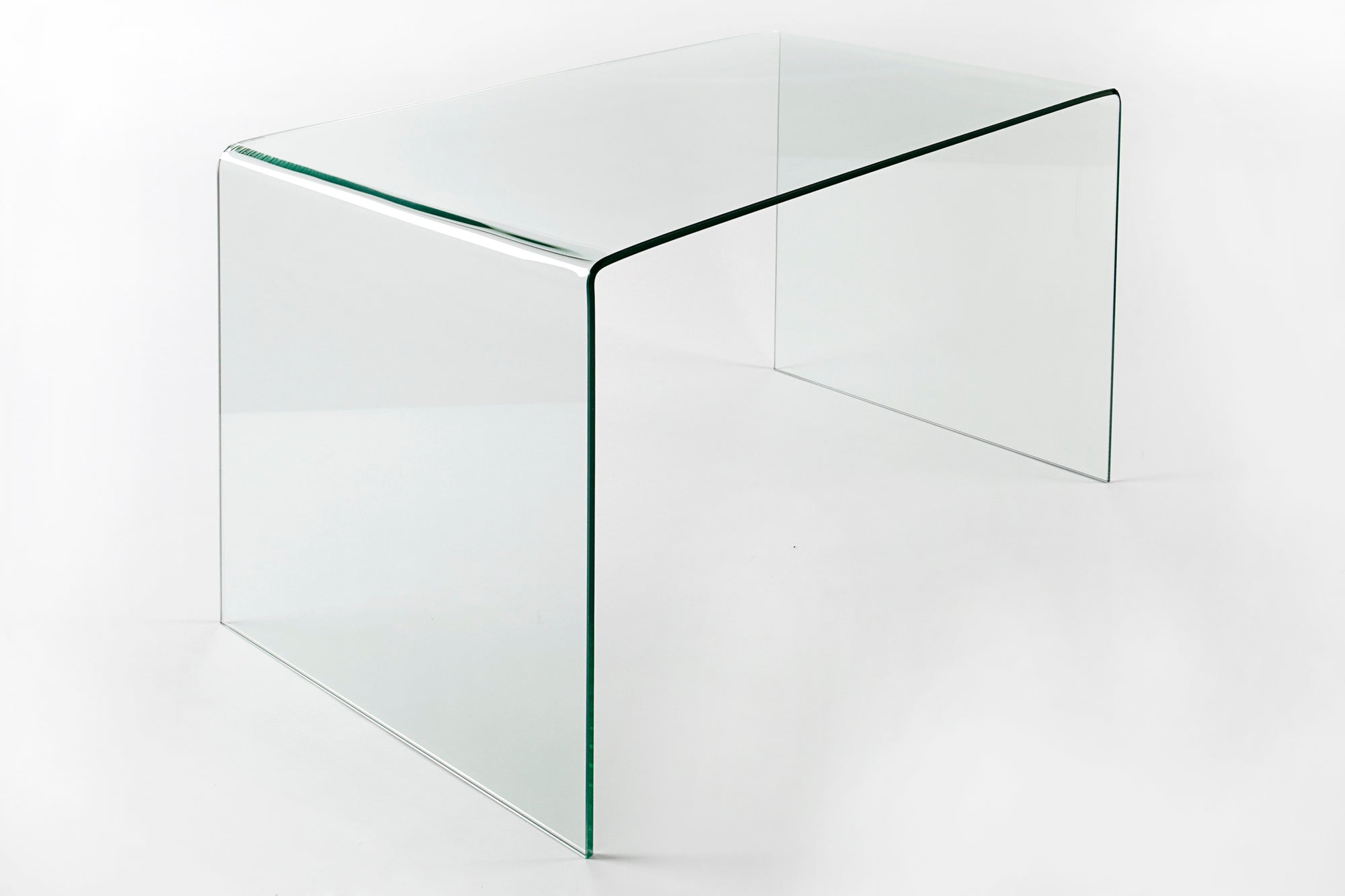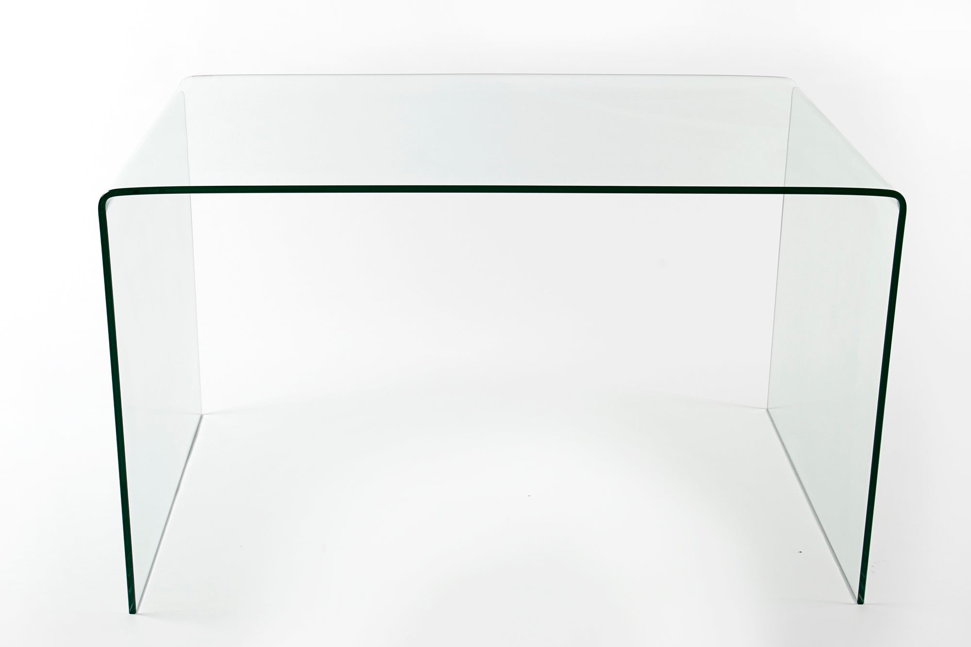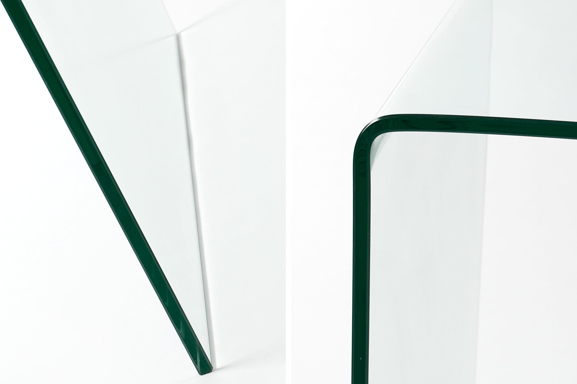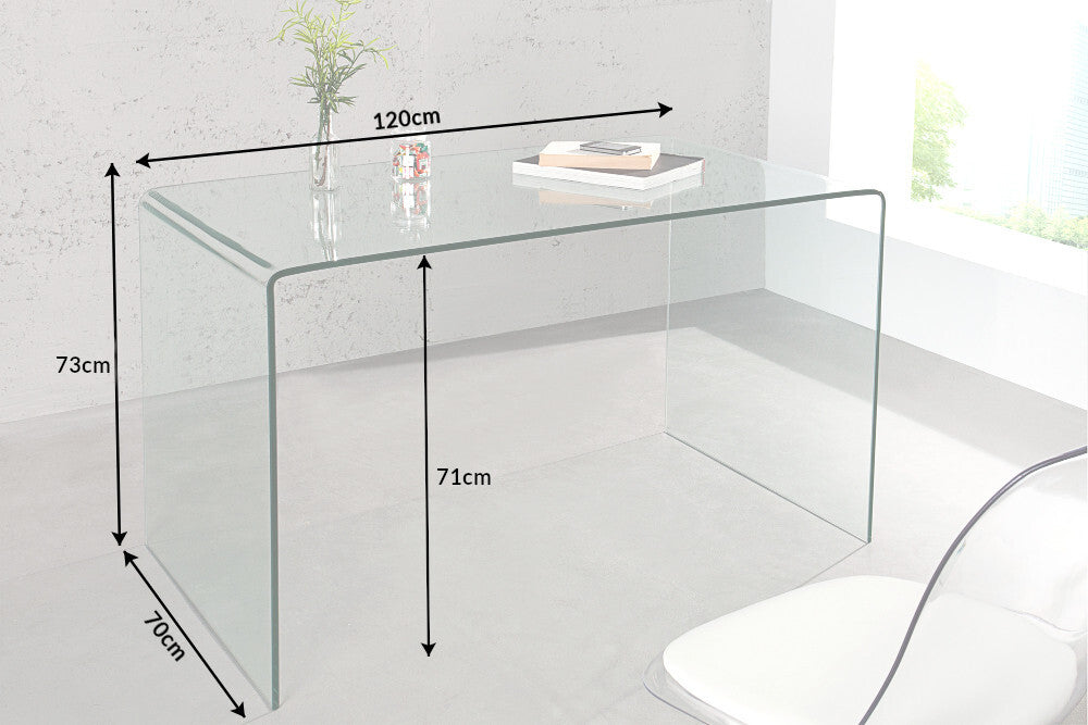 Konstrukcja została wykonana z jednego, giętego elementu szkła, co eliminuje widoczne łączenia i podkreśla wysoką jakość wykonania. Zaokrąglone krawędzie oraz jednolita forma nadają stołowi nowoczesny i ekskluzywny wygląd. Dzięki uniwersalnemu designowi mebel może pełnić funkcję stołu do jadalni, biurka lub konsoli.