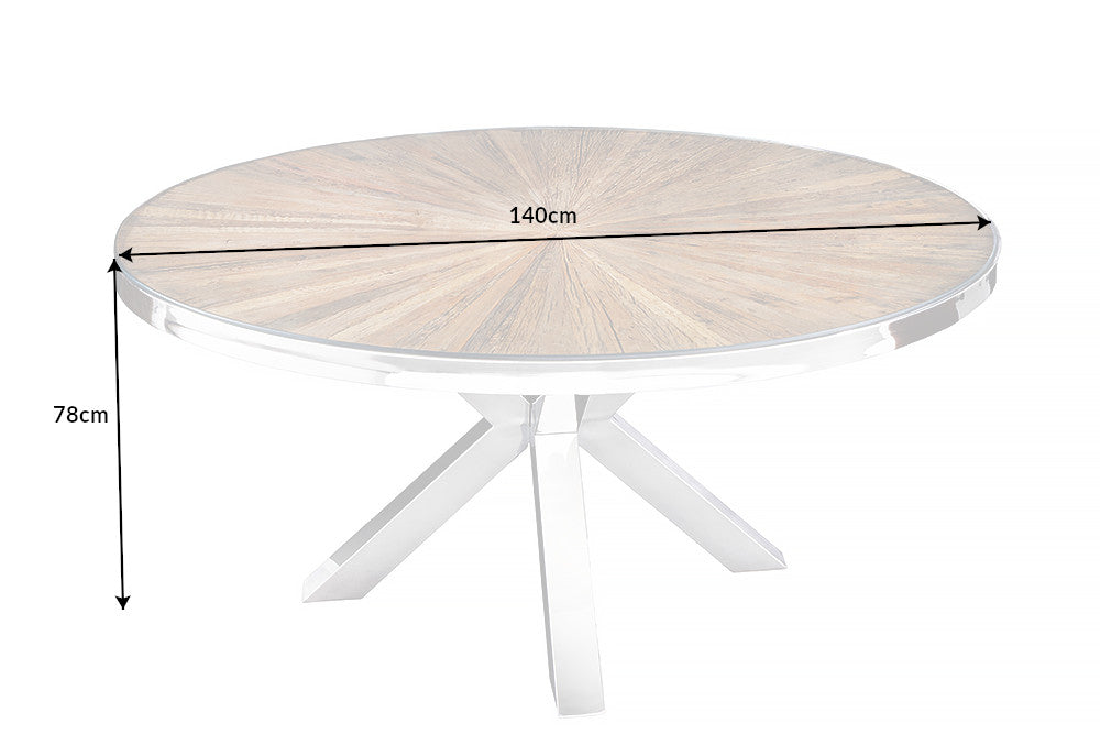 Okrągły stół jadalniany marki Invicta Interior łączy naturalne drewno tekowe z hartowaną szybą oraz metalową podstawą. Wyraźna struktura drewna i transparentny blat tworzą efekt lekkości, a jednocześnie zachowują solidny, masywny charakter mebla.