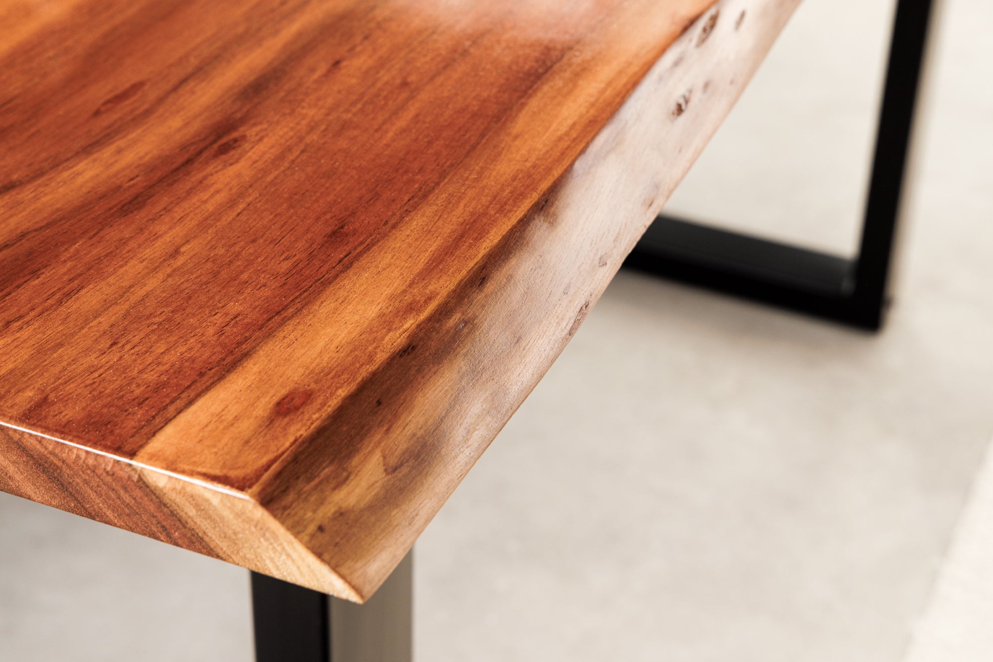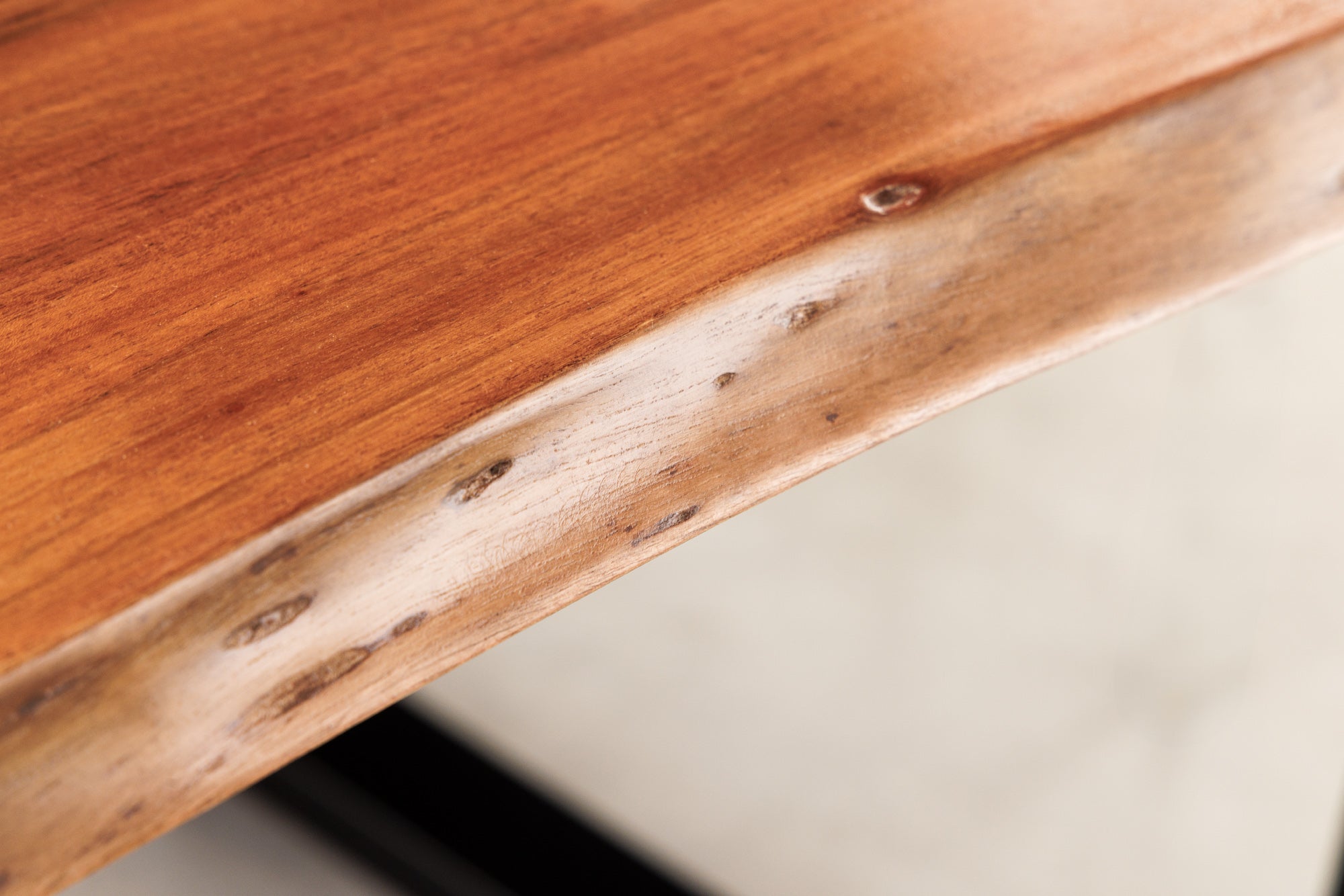 Wyjątkowy stół jadalniany marki Invicta Interior, wykonany z naturalnego drewna akacjowego połączonego z dekoracyjną wstawką z żywicy epoksydowej. Kontrast między ciepłym odcieniem drewna a nowoczesnym elementem żywicy tworzy efekt inspirowany tzw. „river table”, nadając meblowi artystyczny i nowoczesny charakter.