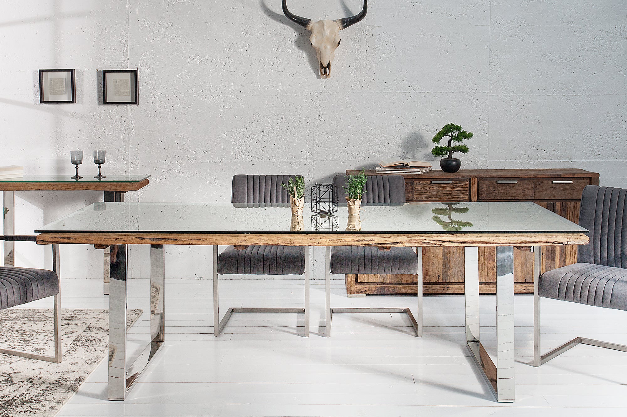 Solidny stół jadalniany o wyrazistym, industrialnym charakterze, który łączy naturalne drewno teak z recyklingu z nowoczesną metalową podstawą. Surowy wygląd blatu, widoczne łączenia elementów oraz naturalne ślady użytkowania tworzą unikalny efekt, dzięki któremu każdy egzemplarz ma swój niepowtarzalny styl.