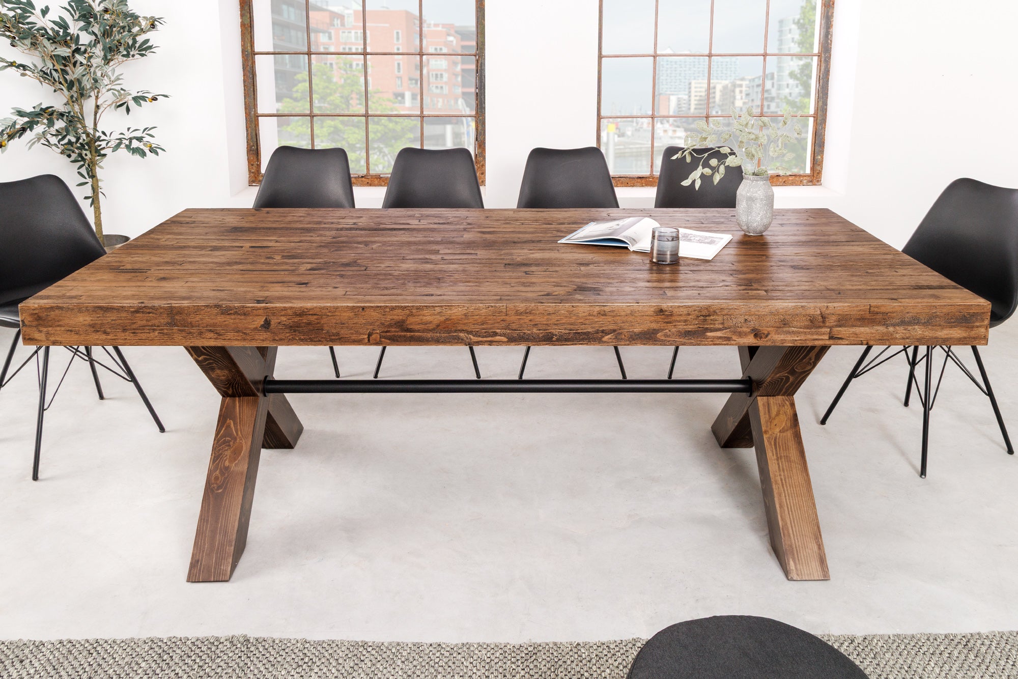 Wyrazisty stół jadalniany marki Invicta Interior, który łączy naturalne drewno sosnowe z solidną konstrukcją z czarnego metalu. Duży, prostokątny blat o długości 210 cm zapewnia wygodną przestrzeń do spożywania posiłków, organizowania rodzinnych obiadów lub spotkań z przyjaciółmi. Surowe połączenie drewna i metalu nadaje meblowi industrialny, loftowy charakter, który doskonale wpisuje się we wnętrza nowoczesne, rustykalne i eklektyczne.