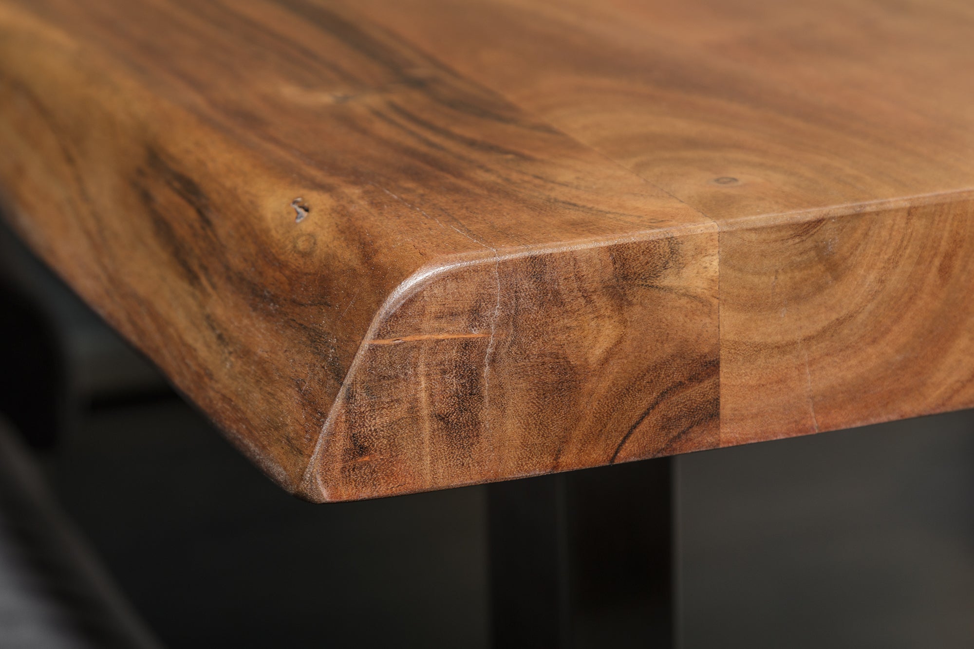 Duży, solidny stół jadalniany o prostych, ale wyrazistych liniach, który łączy naturalne materiały z nowoczesną formą. Blat wykonany z litego drewna akacjowego o grubości 60 mm podkreśla wysoką jakość wykonania i dodaje wnętrzu ciepłego, eleganckiego charakteru.