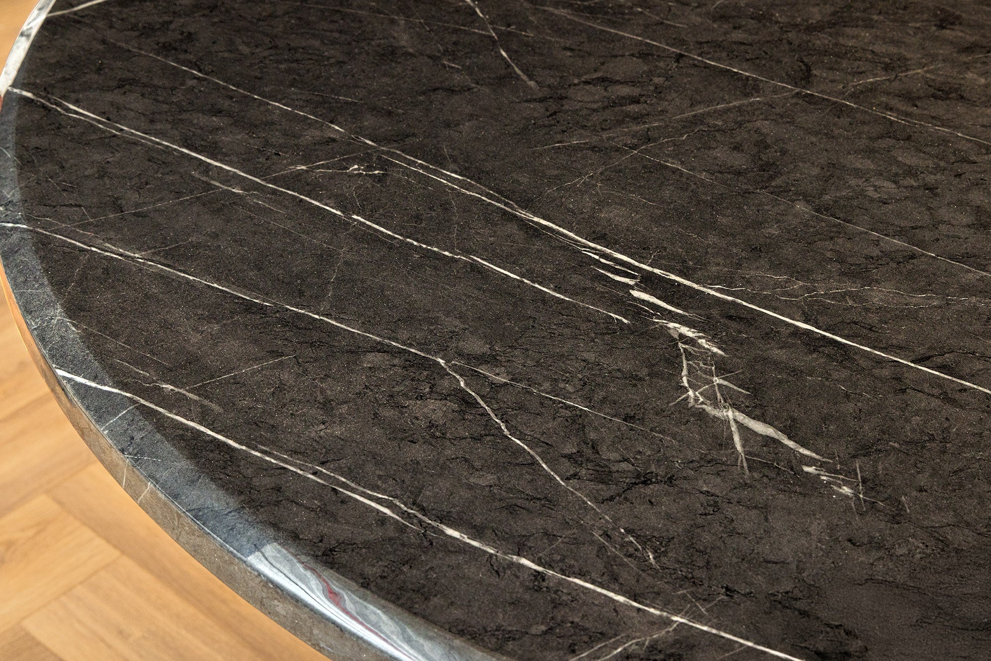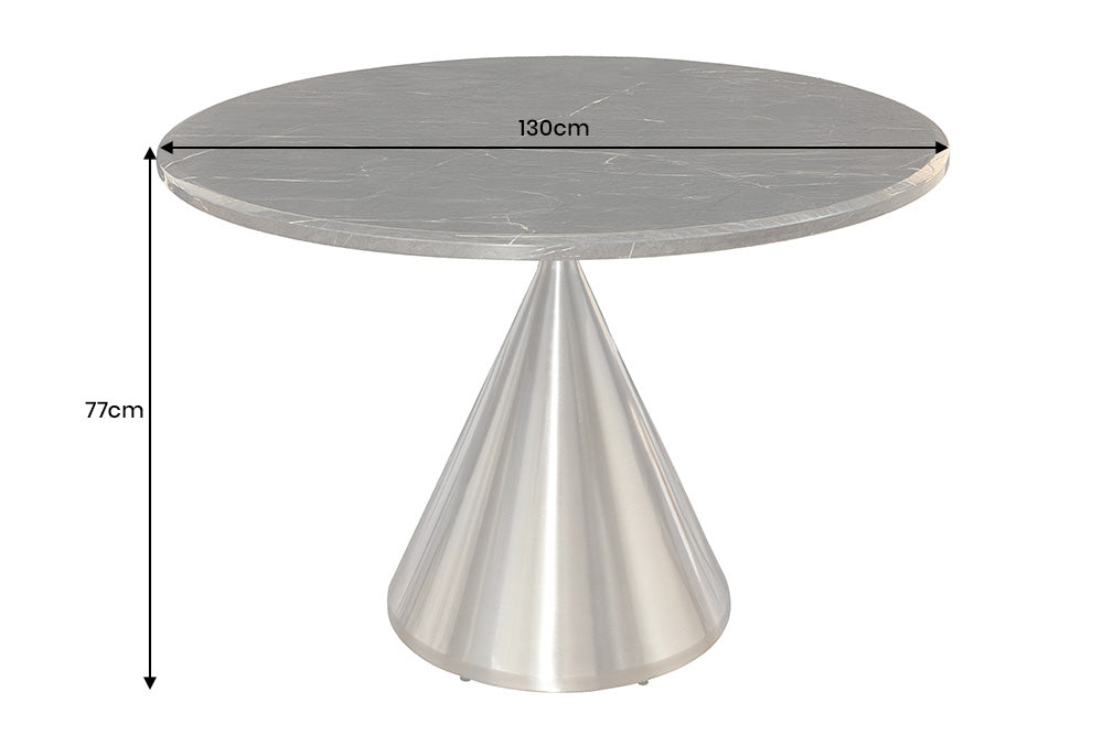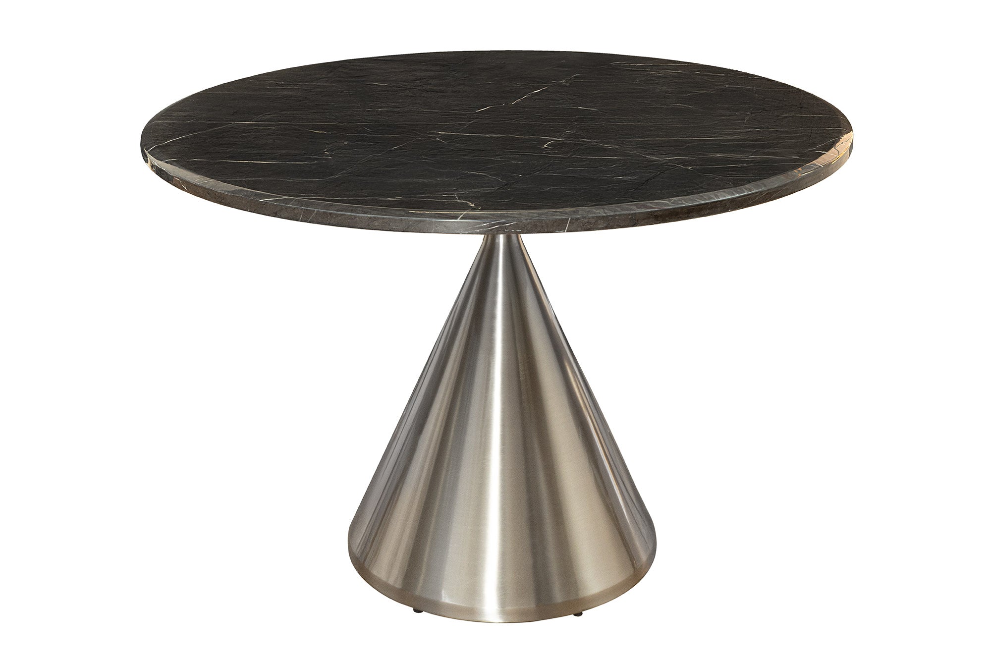 Okrągły stół jadalniany marki Invicta Interior o eleganckiej, nowoczesnej formie. Blat w wykończeniu imitującym czarny marmur nadaje meblowi luksusowy charakter, a chromowana podstawa podkreśla jego dekoracyjny styl.