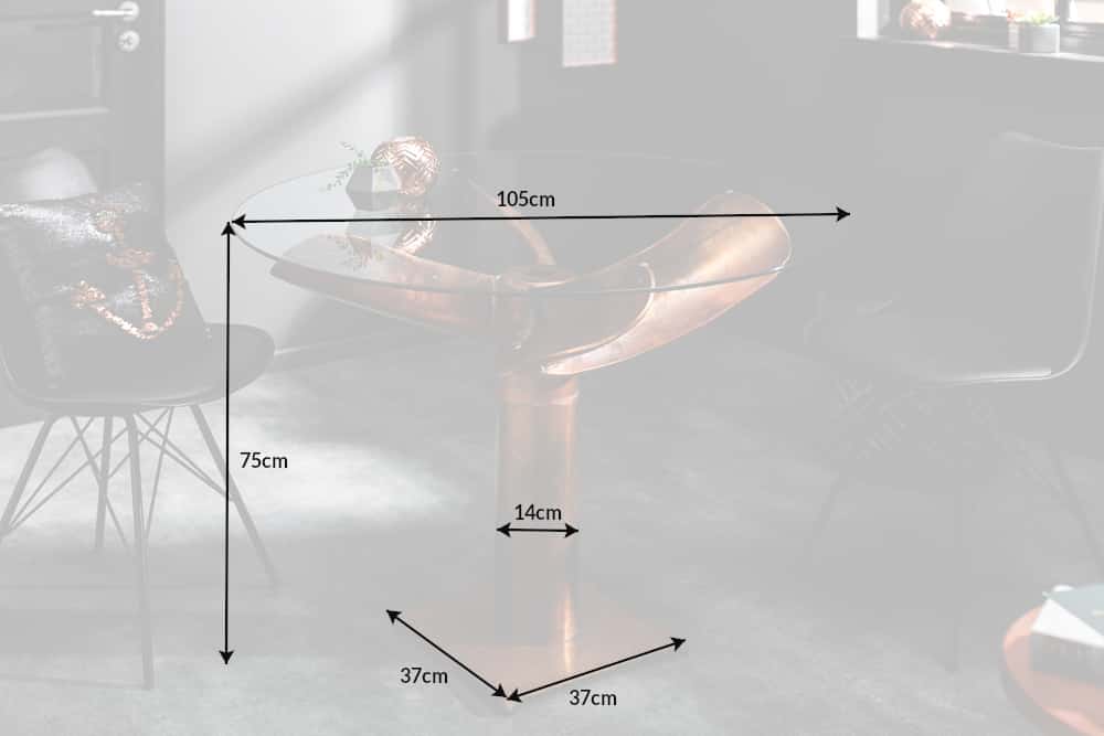 Wyjątkowy stół jadalniany o nowoczesnym, dekoracyjnym charakterze. Konstrukcja oparta na solidnej metalowej podstawie w wykończeniu imitującym postarzaną miedź tworzy efektowny element aranżacyjny. Całość uzupełnia szklany blat, który nadaje konstrukcji lekkości i pozwala w pełni wyeksponować dekoracyjną formę podstawy.