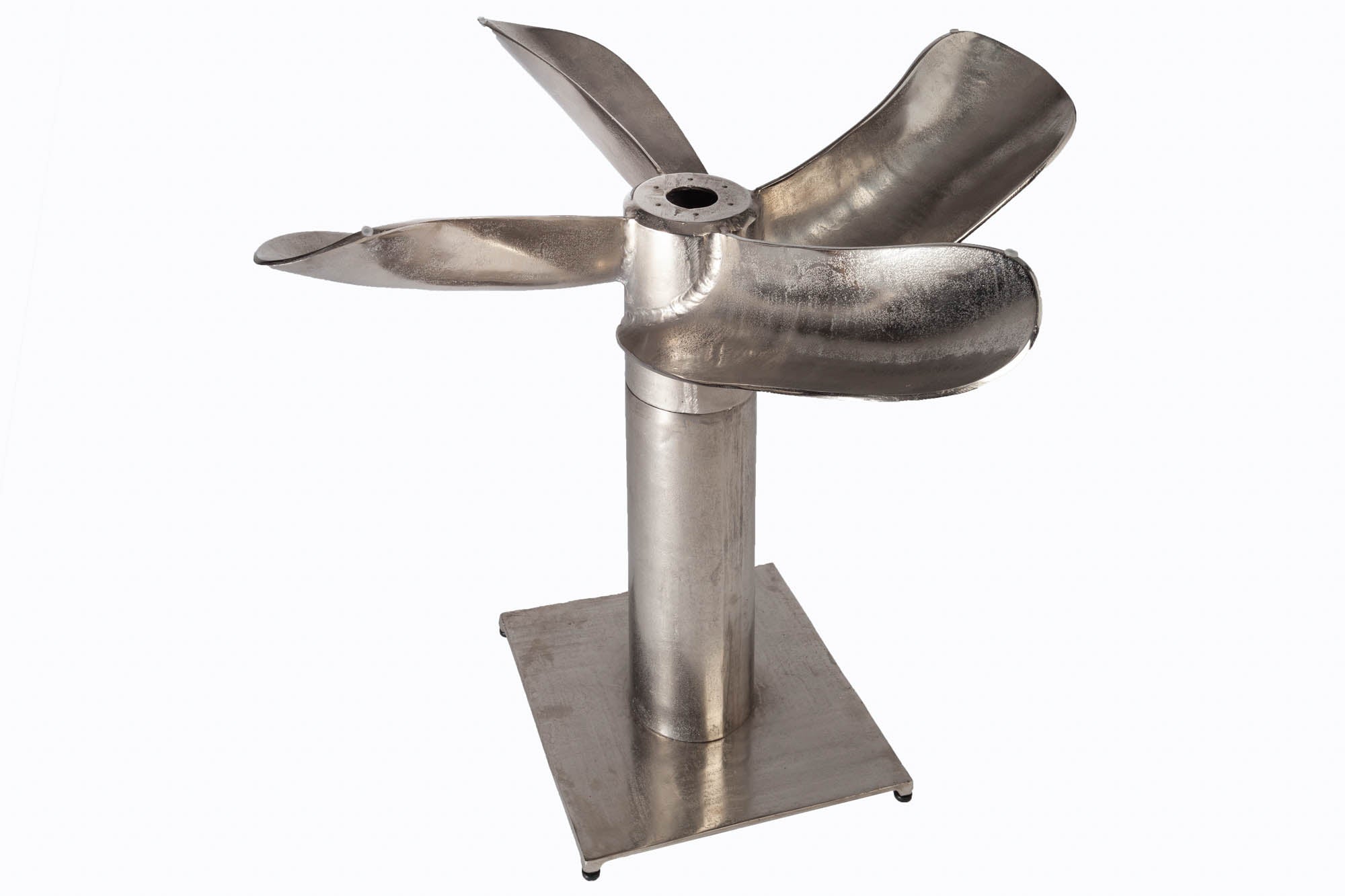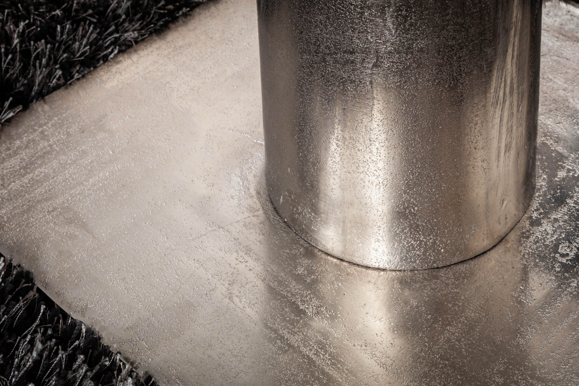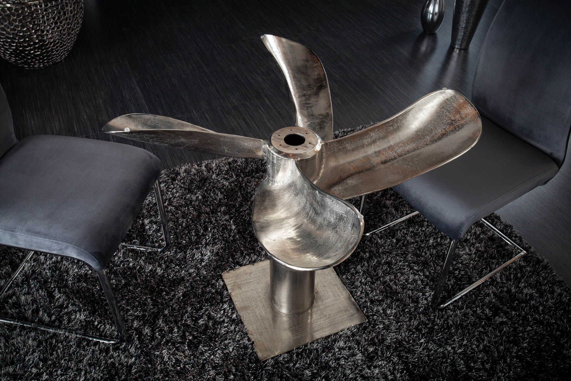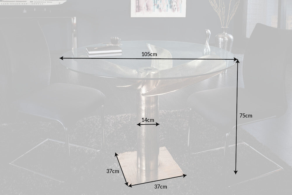 Designerski stół jadalniany o nowoczesnym charakterze, który przyciąga uwagę rzeźbiarską formą podstawy. Konstrukcja wykonana z aluminium w srebrnym wykończeniu tworzy stabilną i dekoracyjną bazę stołu, a okrągły blat ze szkła nadaje całości lekkości i elegancji.