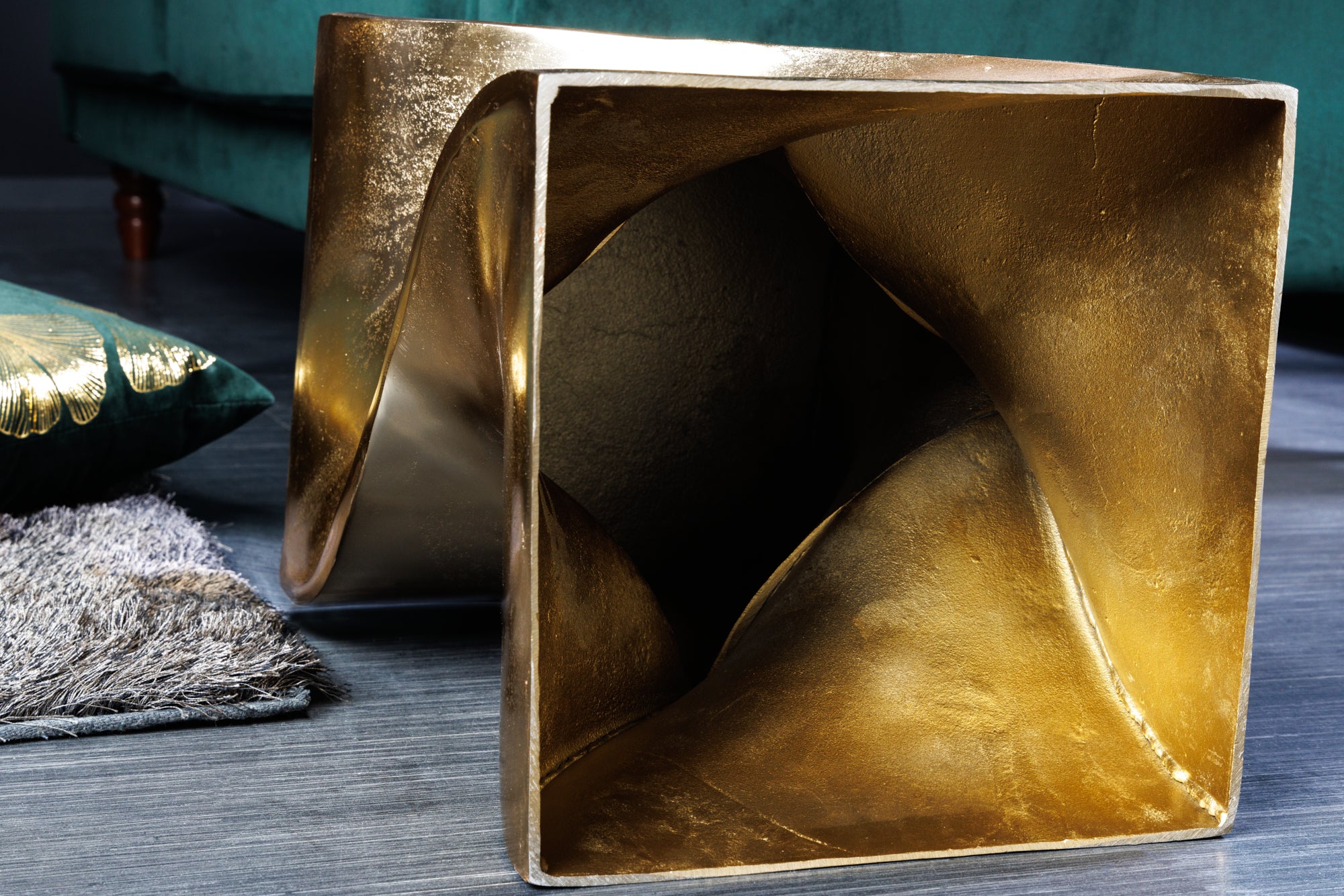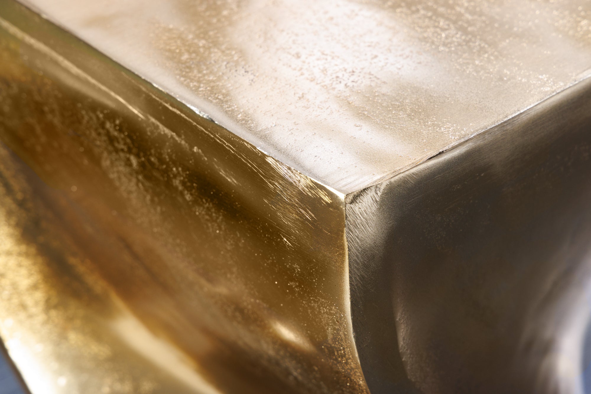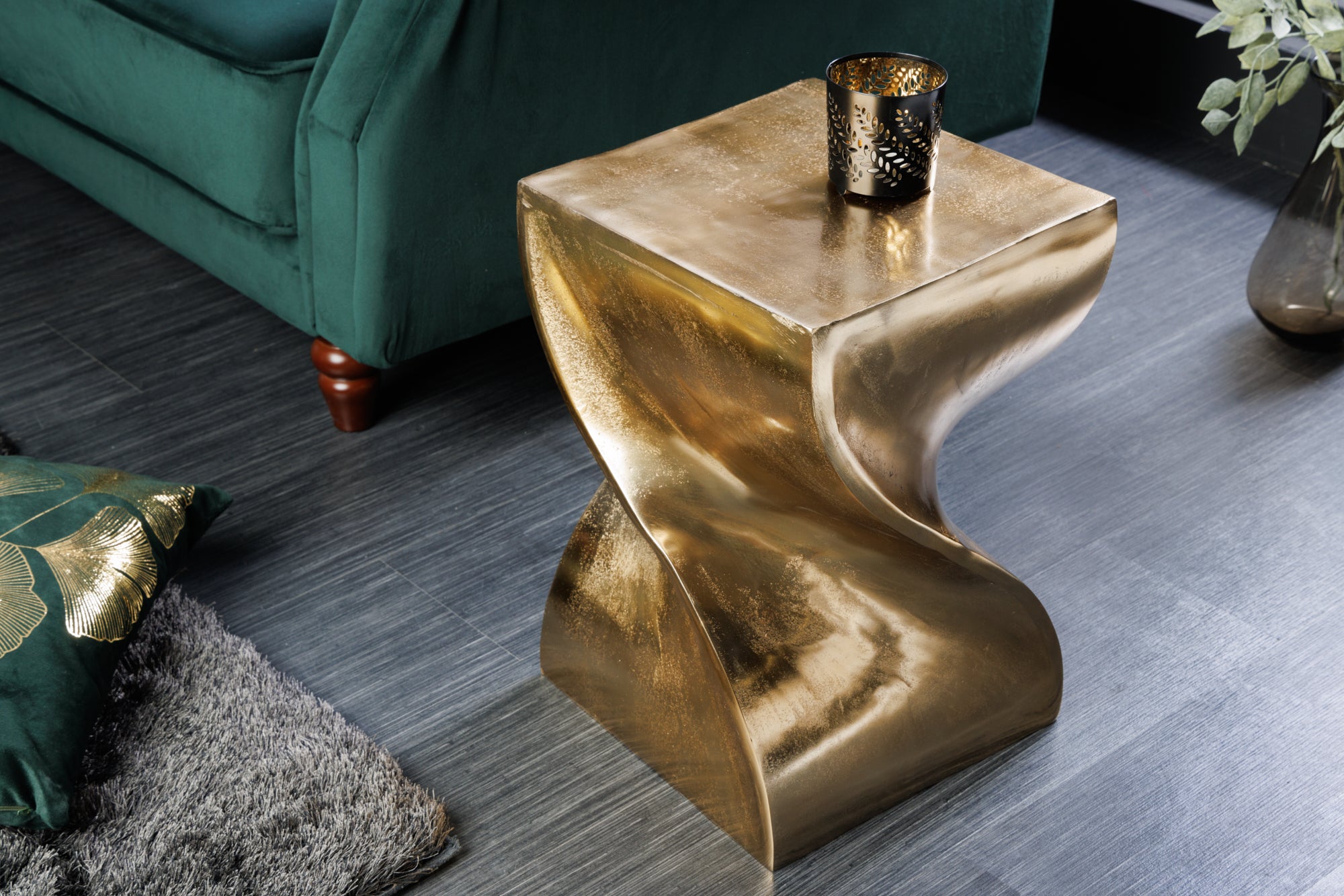 Dekoracyjny stołek marki Invicta Interior wykonany z metalu w złotym wykończeniu. Skręcona, spiralna forma nadaje mu rzeźbiarski charakter, dzięki czemu może pełnić funkcję siedziska, stolika pomocniczego lub elementu dekoracyjnego.