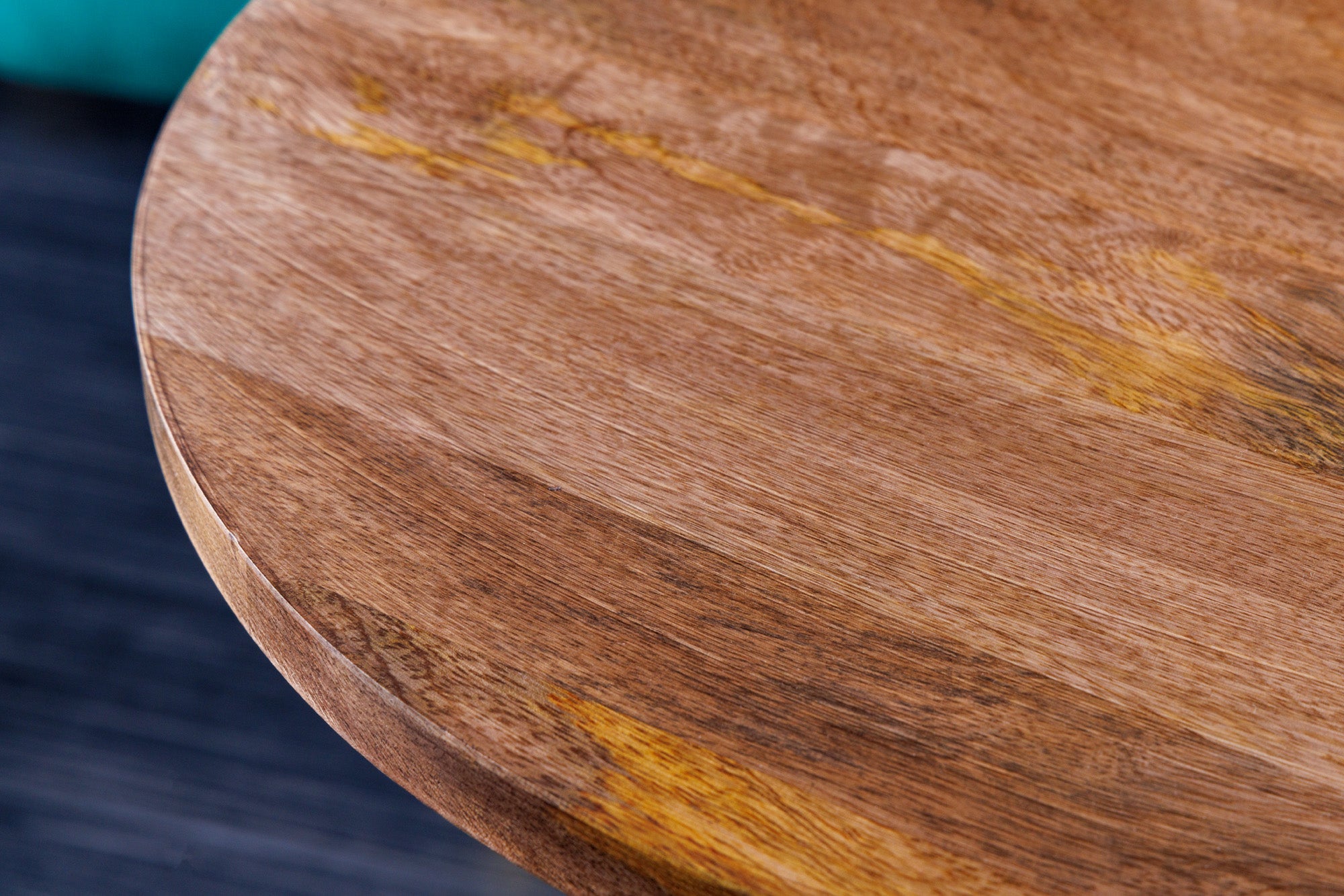Dekoracyjny stolik pomocniczy marki Invicta Interior z blatem z litego drewna mango oraz charakterystyczną podstawą w formie łańcucha. Połączenie naturalnego drewna z metalową, rzeźbiarską konstrukcją tworzy wyrazisty akcent aranżacyjny i ociepla nowoczesne wnętrze.