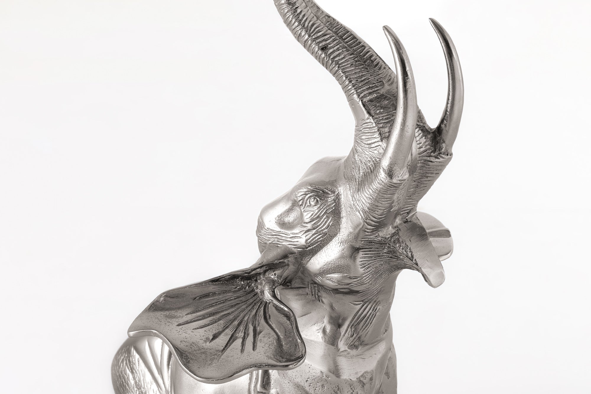 Dekoracyjny stolik boczny marki Invicta Interior w formie rzeźby słonia wykonany z aluminium w srebrnym wykończeniu, uzupełniony okrągłym blatem z marmuru. Połączenie funkcji użytkowej z figurą dekoracyjną nadaje meblowi elegancki i egzotyczny charakter, przyciągając uwagę jako element aranżacyjny.