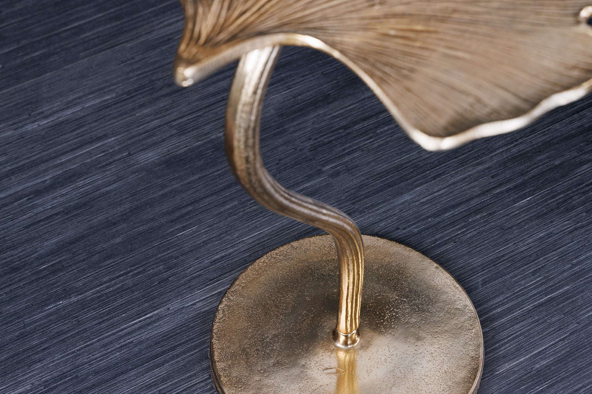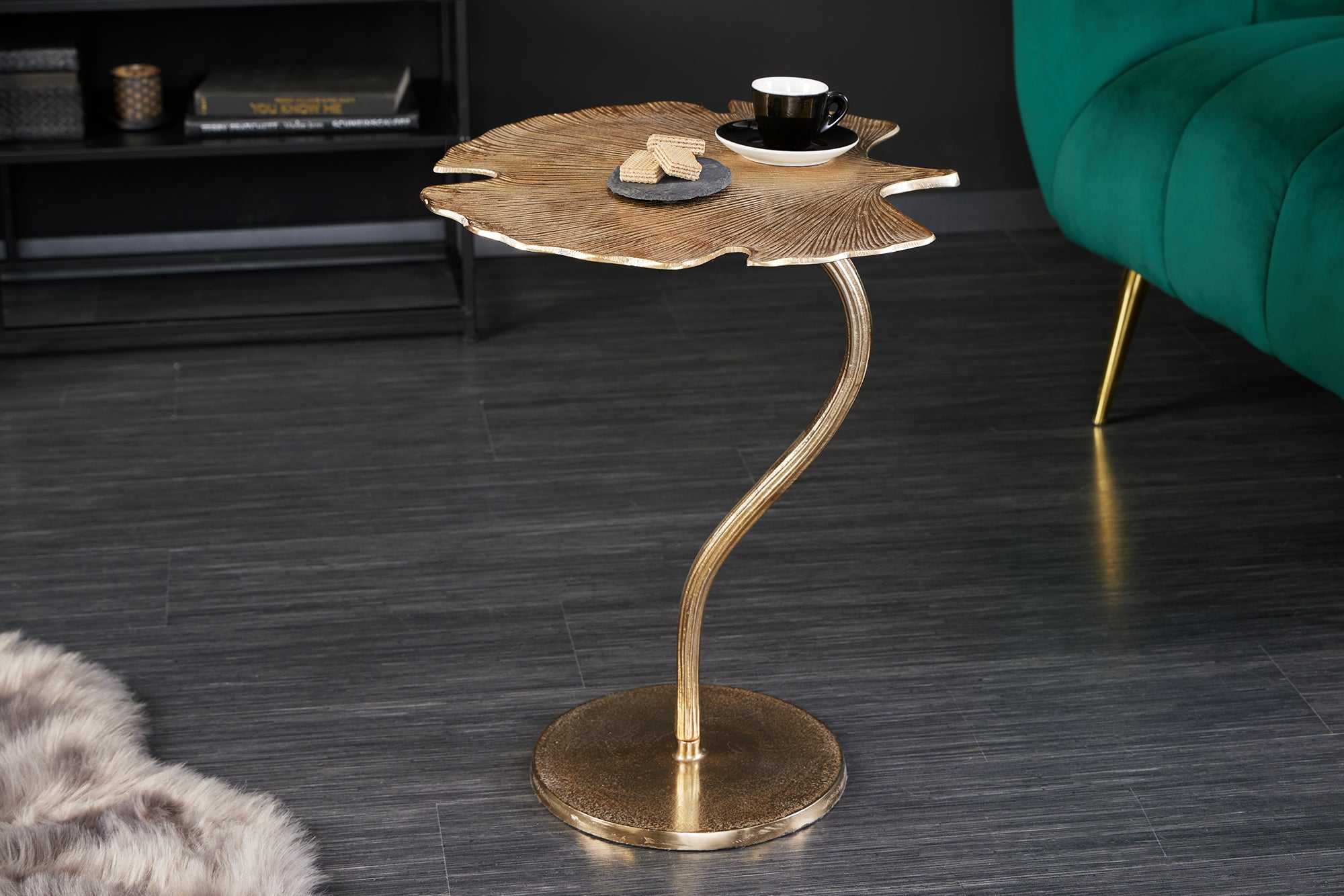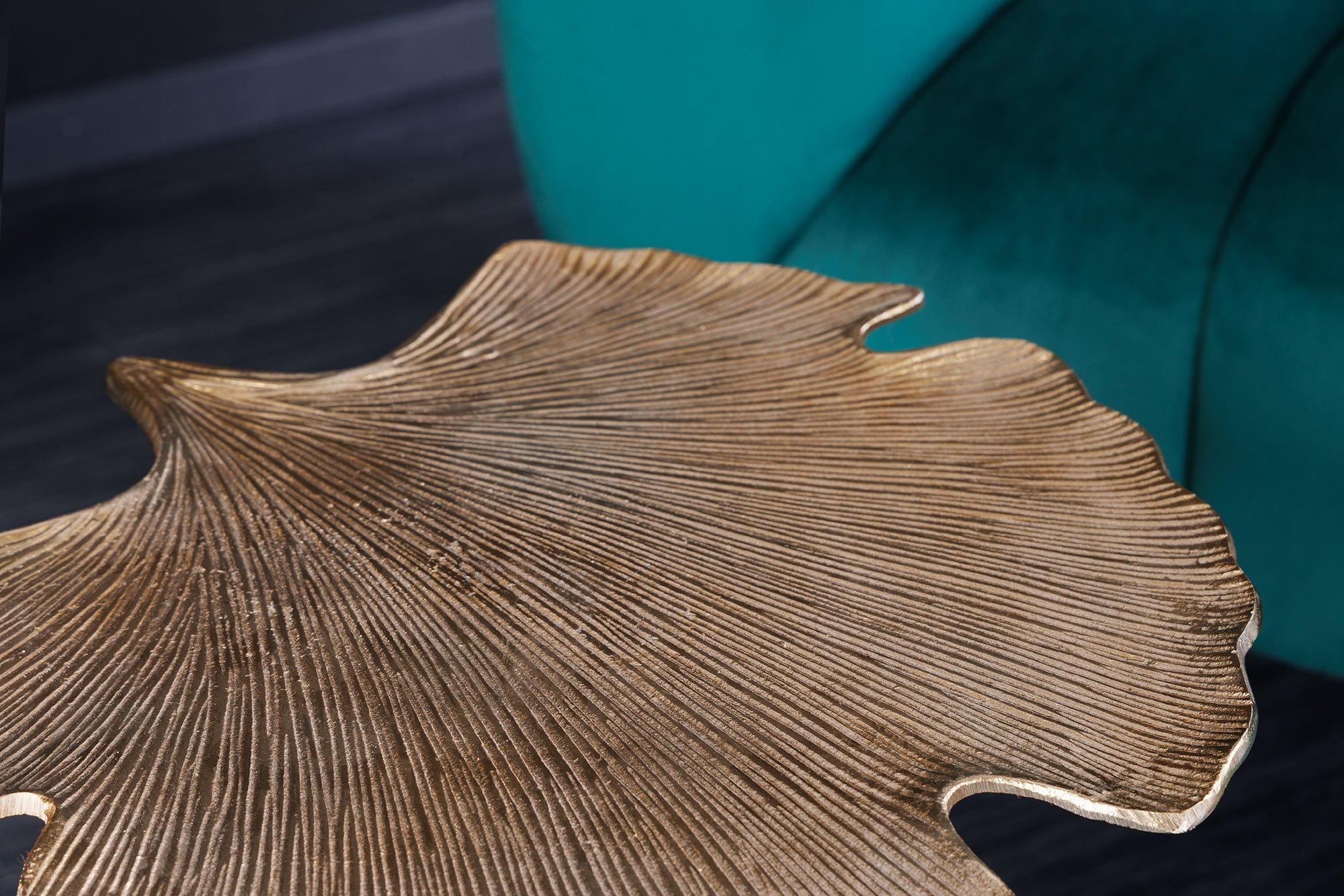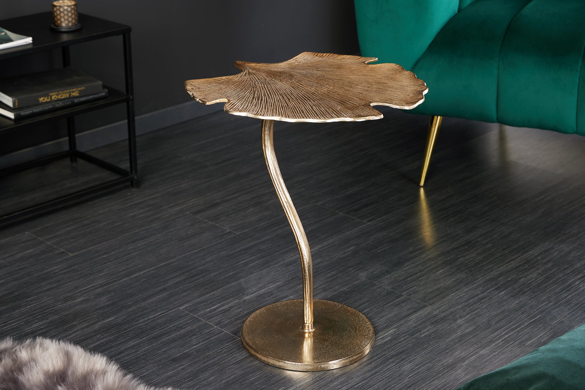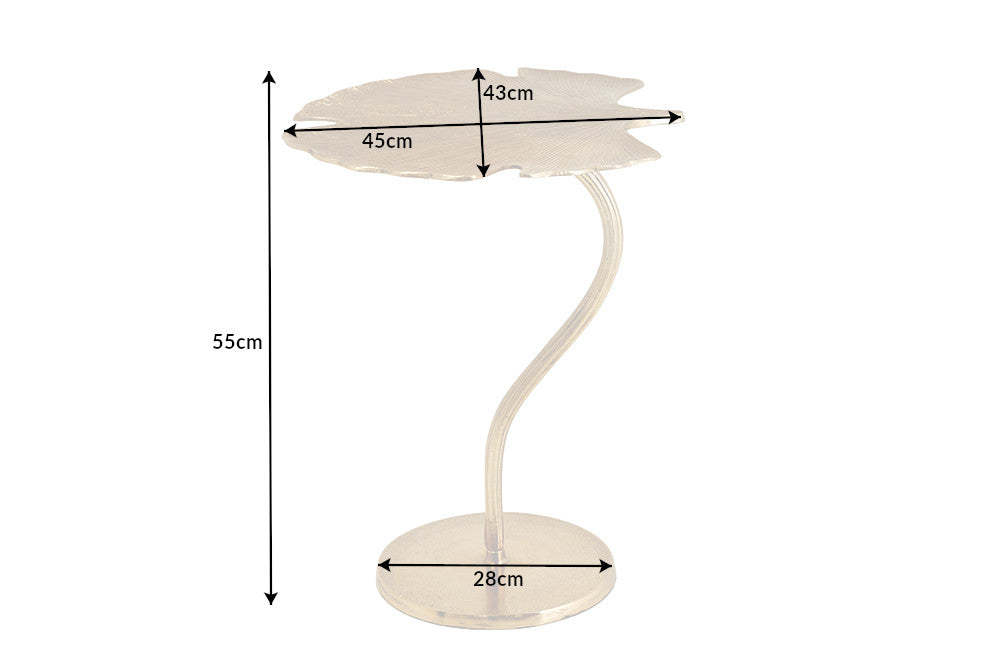 Dekoracyjny stolik pomocniczy marki Invicta Interior z blatem w kształcie liścia miłorzębu w złotym wykończeniu oraz metalową podstawą. Rzeźbiarska forma nadaje wnętrzu elegancki, artystyczny charakter i sprawia, że mebel pełni rolę zarówno stolika, jak i ozdoby.