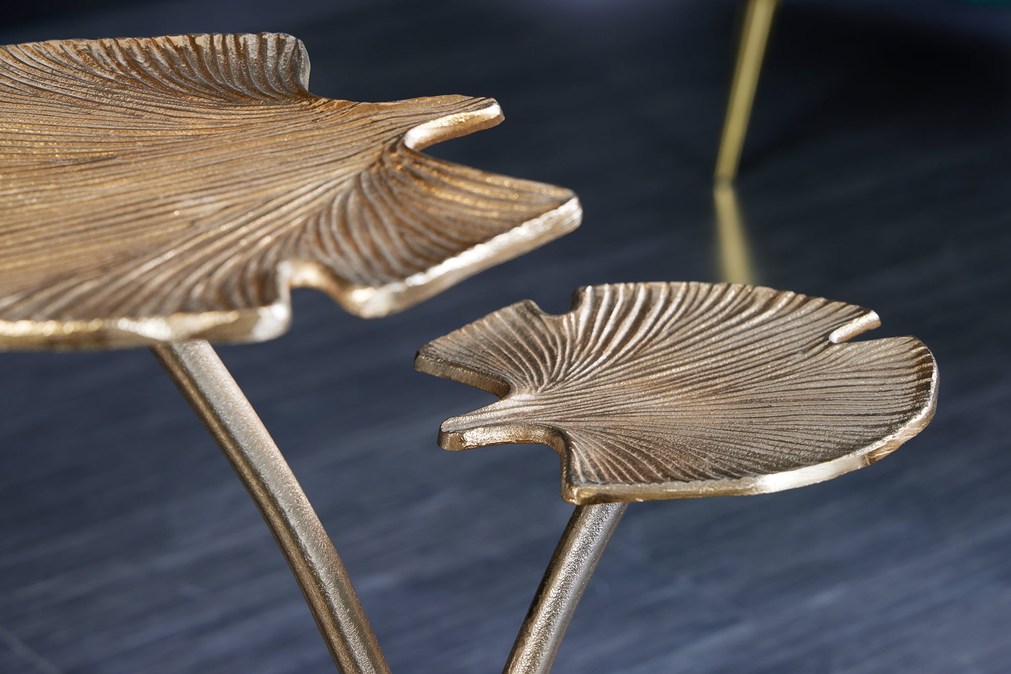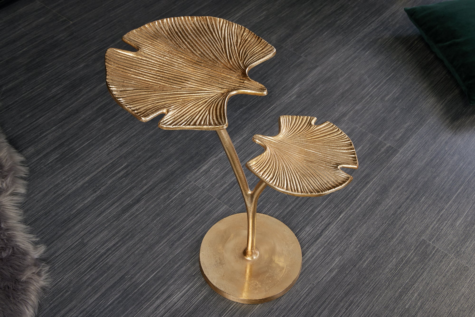 Dekoracyjny stolik pomocniczy marki Invicta Interior z ażurowym blatem inspirowanym liśćmi miłorzębu w złotym wykończeniu oraz metalową podstawą. Bogaty roślinny wzór nadaje wnętrzu elegancki, lekko artystyczny charakter i sprawia, że stolik staje się ozdobą samą w sobie.