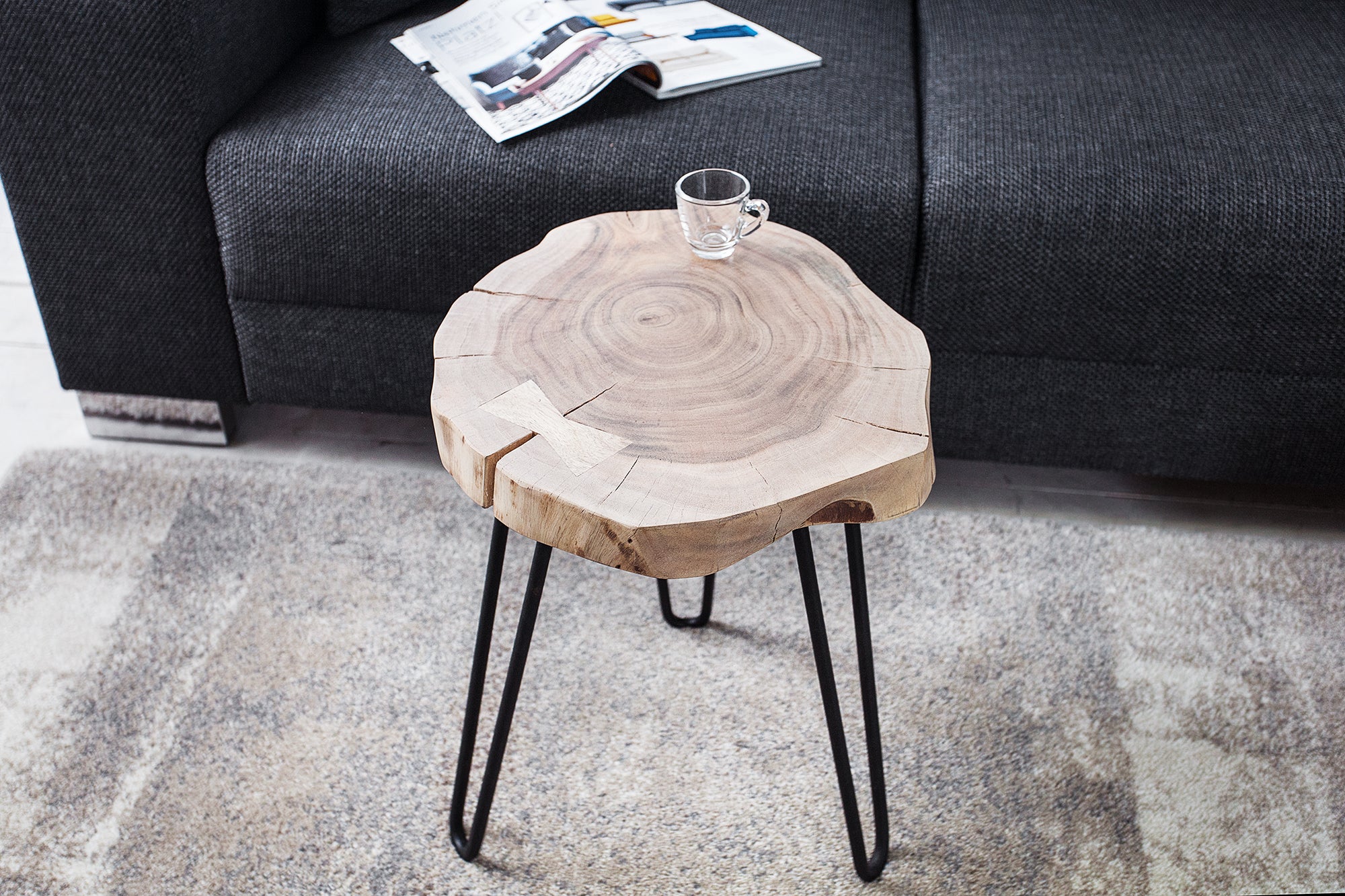 Kompaktowy stolik boczny, który łączy naturalne piękno litego drewna akacji z nowoczesnym, loftowym charakterem metalowej podstawy. Blat o organicznej formie przypomina naturalny przekrój pnia drzewa, dzięki czemu każdy egzemplarz wyróżnia się unikalnym wyglądem.