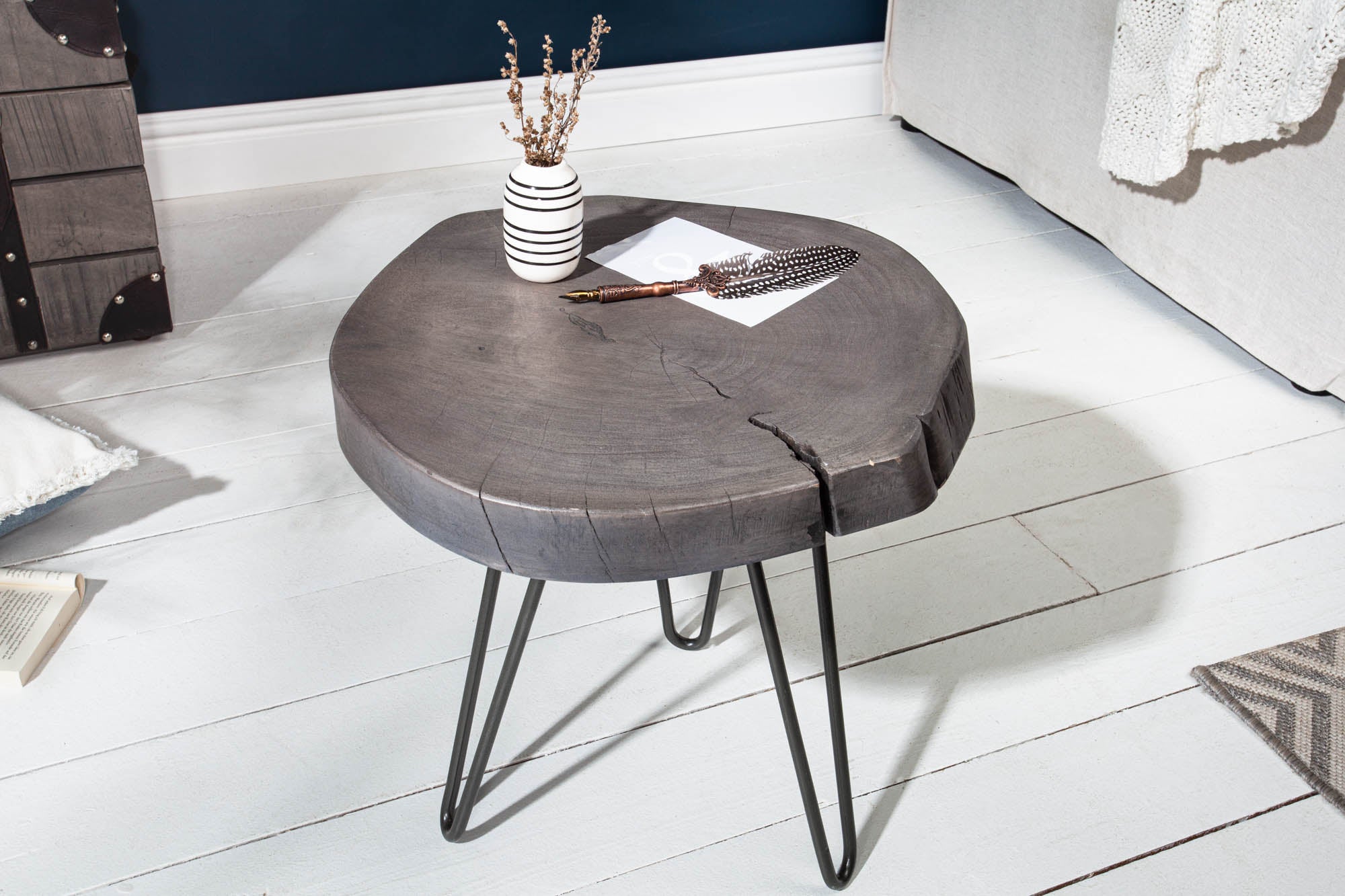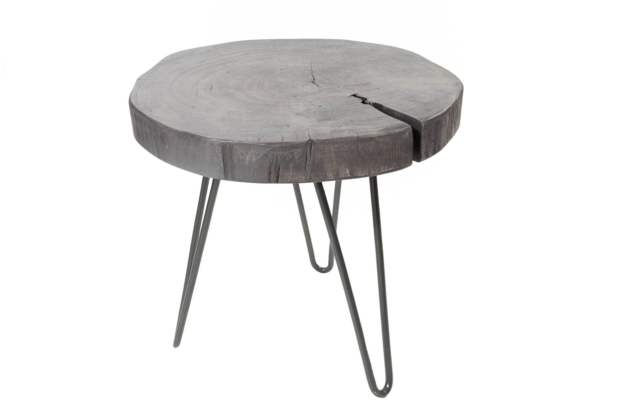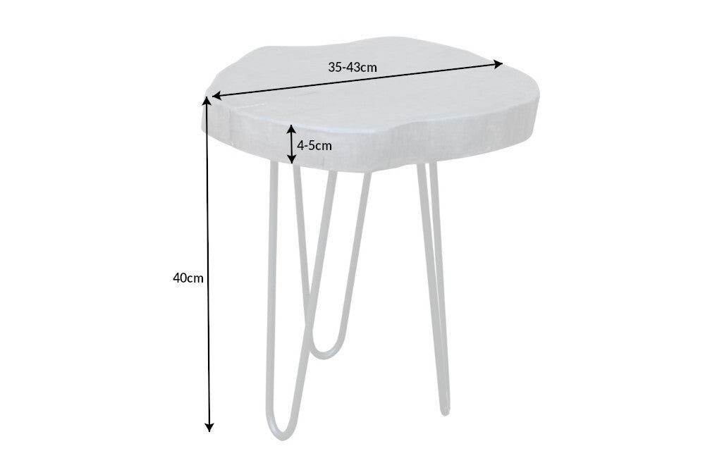 Kompaktowy stolik boczny o industrialnym charakterze, który łączy naturalne drewno z lekką metalową konstrukcją. Blat wykonany z litego drewna akacjowego wyróżnia się naturalną strukturą oraz szarym wykończeniem, które nadaje meblowi nowoczesny i dekoracyjny wygląd. Dzięki nieregularnej formie drewna każdy egzemplarz posiada indywidualny charakter.