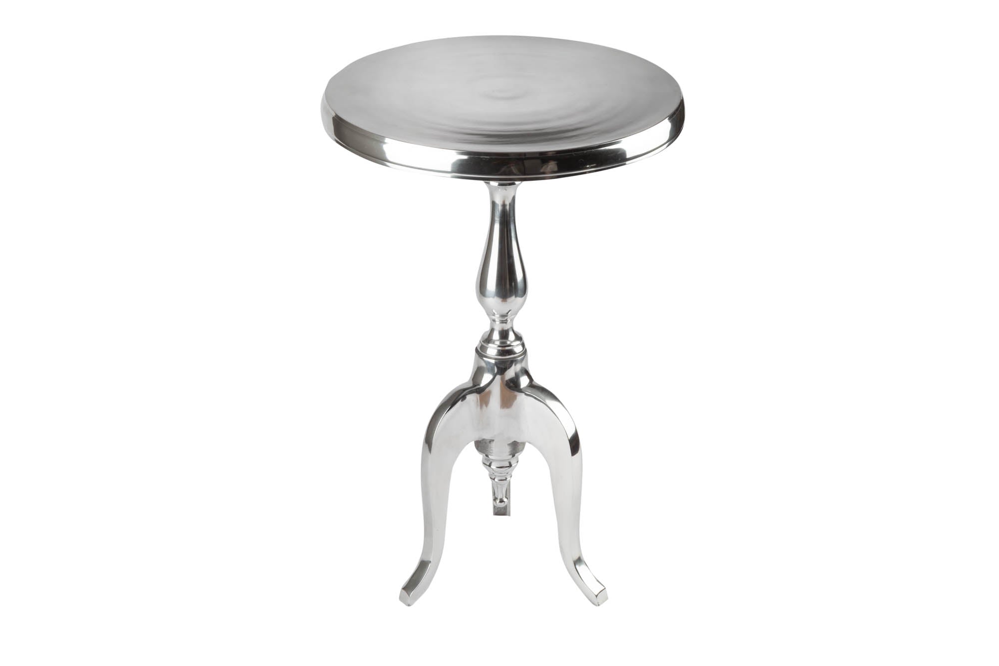 Elegancki stolik boczny o dekoracyjnym charakterze, który łączy klasyczną stylistykę barokową z nowoczesnym wykończeniem. Wykonany w całości z aluminium w błyszczącym, srebrnym kolorze, przyciąga uwagę swoją formą i subtelnymi zdobieniami.