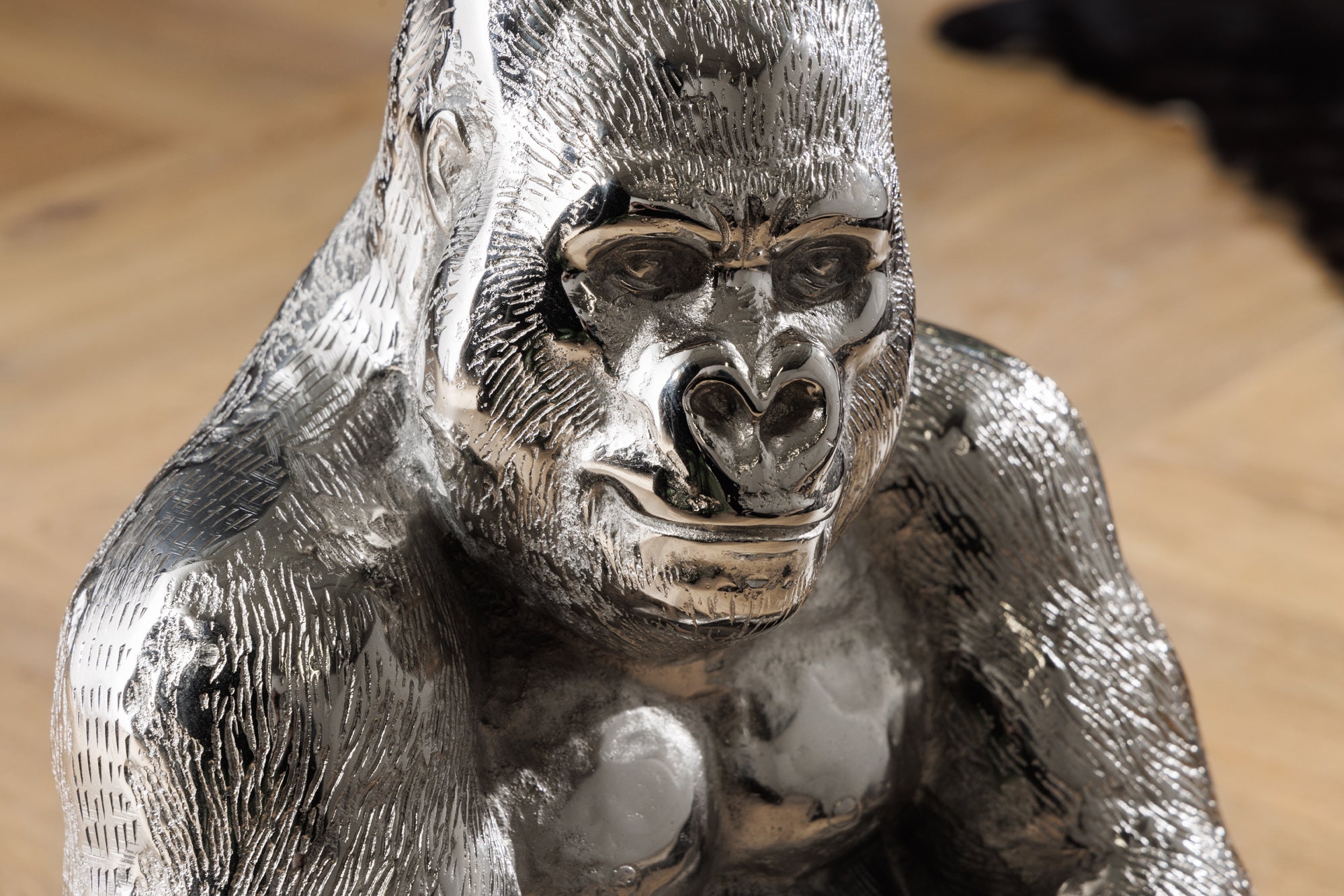 Dekoracyjny stolik boczny marki Invicta Interior o rzeźbiarskiej formie inspirowanej figurą goryla. Srebrne wykończenie nadaje meblowi efektowny charakter, a okrągły blat ze szkła stanowi praktyczną powierzchnię użytkową.