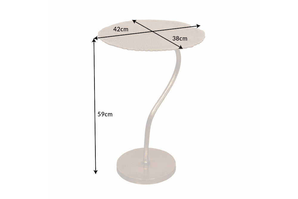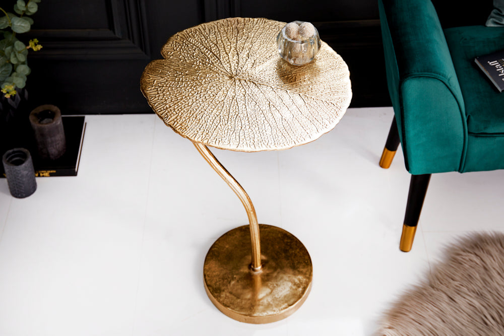 Efektowny stolik boczny o oryginalnej formie inspirowanej kształtem liścia. Model LEAF wyróżnia się dekoracyjnym blatem oraz eleganckim, złotym wykończeniem, które dodaje wnętrzu luksusowego akcentu. To idealny dodatek do salonu, sypialni lub kącika relaksacyjnego, gdzie pełni zarówno funkcję praktyczną, jak i dekoracyjną.
