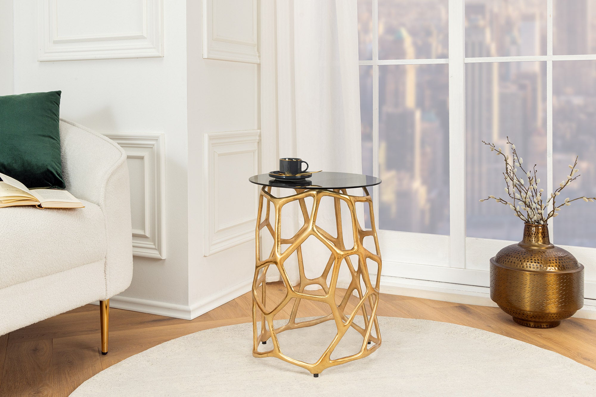 Model LIQUID GEOMETRIE doskonale sprawdzi się jako stolik pomocniczy przy sofie lub fotelu, wprowadzając do aranżacji styl glamour i nowoczesną elegancję.