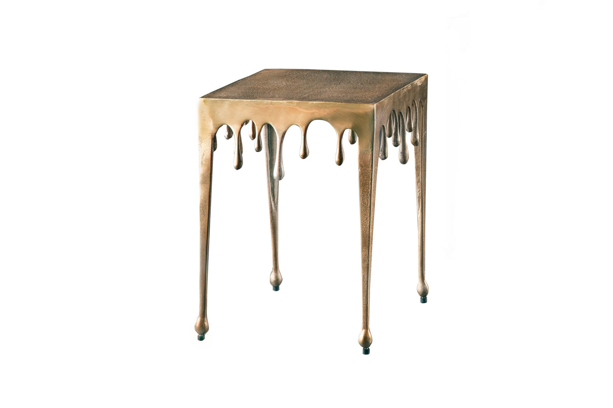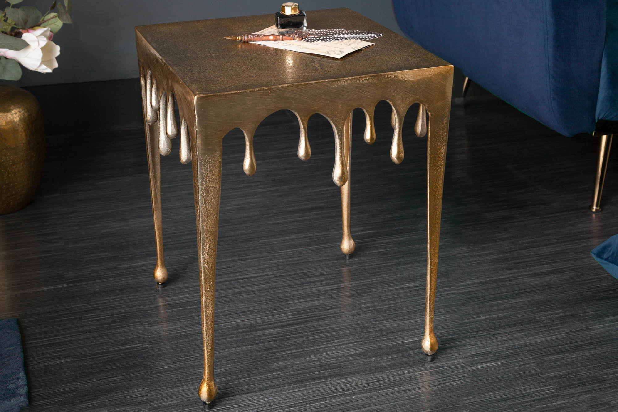 Nowoczesny stolik boczny o geometrycznej, kwadratowej formie i efektownym, złotym wykończeniu. Model LIQUID LINE S wyróżnia się minimalistycznym designem z dekoracyjną powierzchnią, która dodaje wnętrzu elegancji i luksusowego charakteru. To stylowy akcent, który sprawdzi się jako praktyczny stolik pomocniczy w salonie, sypialni lub innym miejscu wypoczynkowym.