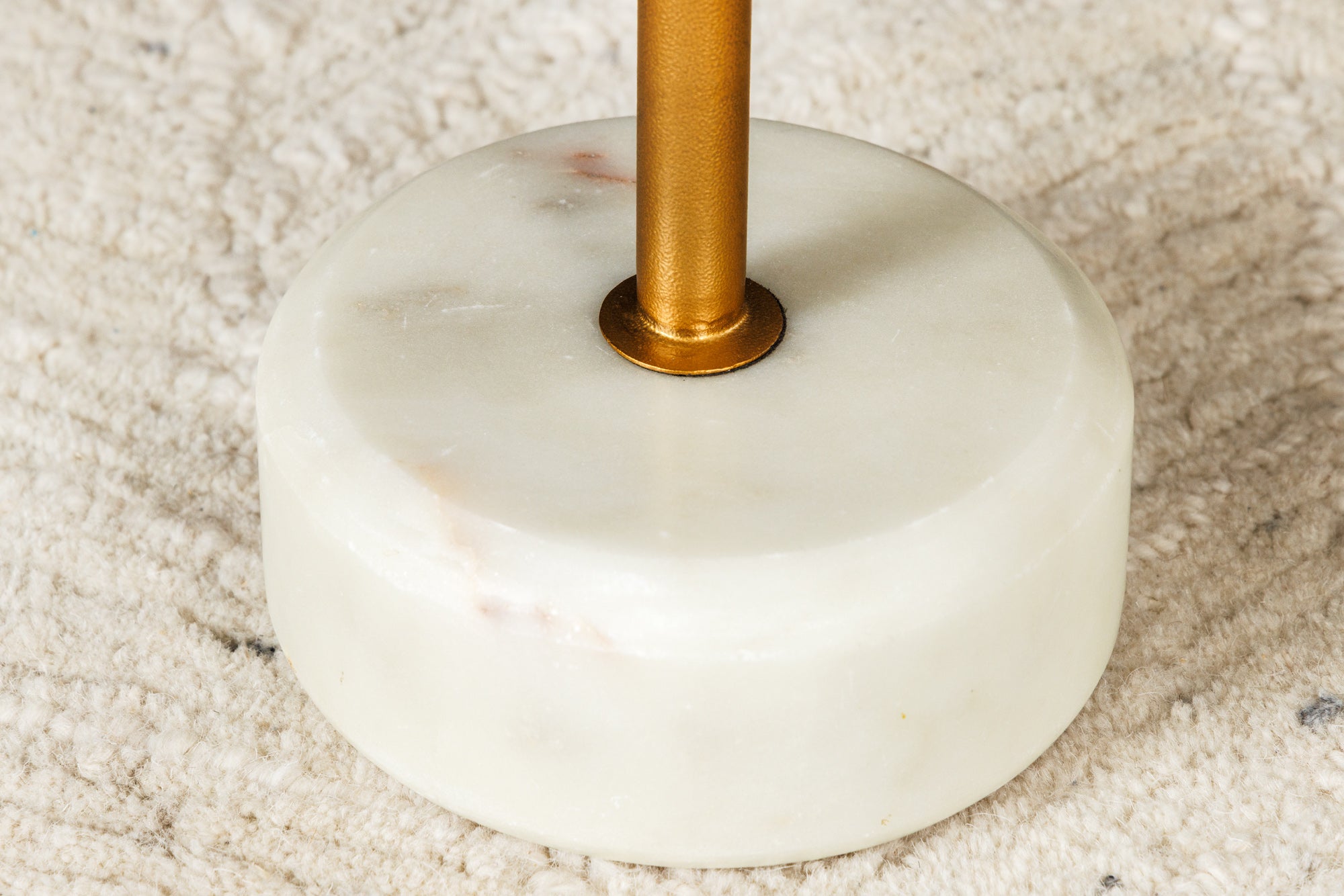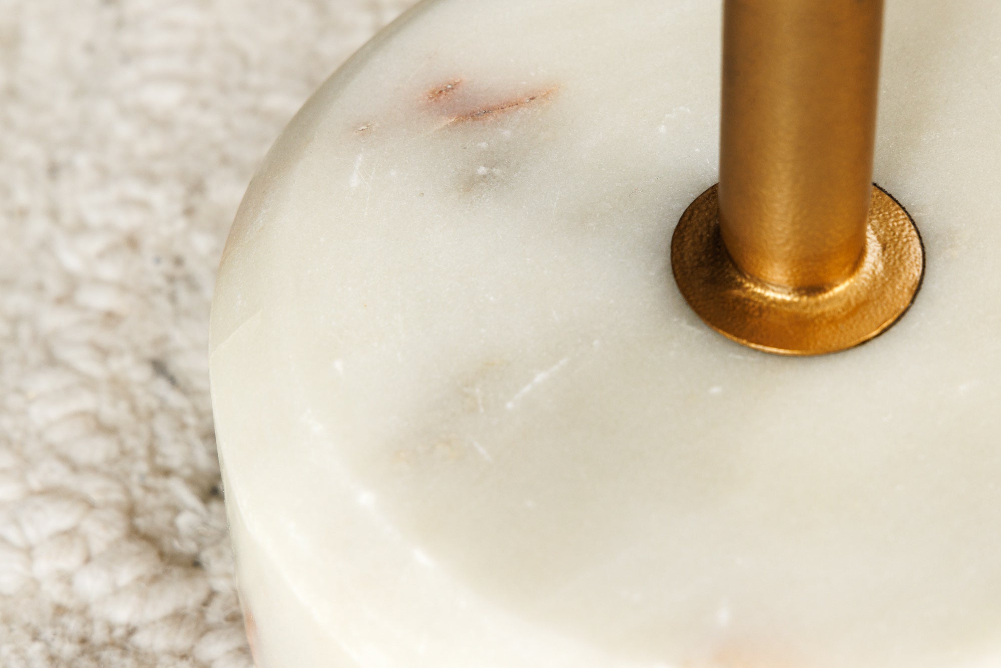 Elegancki stolik boczny marki Invicta Interior, który łączy dekoracyjną podstawę o wyglądzie białego marmuru z metalowym blatem w złotym wykończeniu. Forma tacy zwiększa funkcjonalność — ustawione przedmioty pozostają stabilnie na powierzchni, a jednocześnie mebel zachowuje lekkość wizualną.