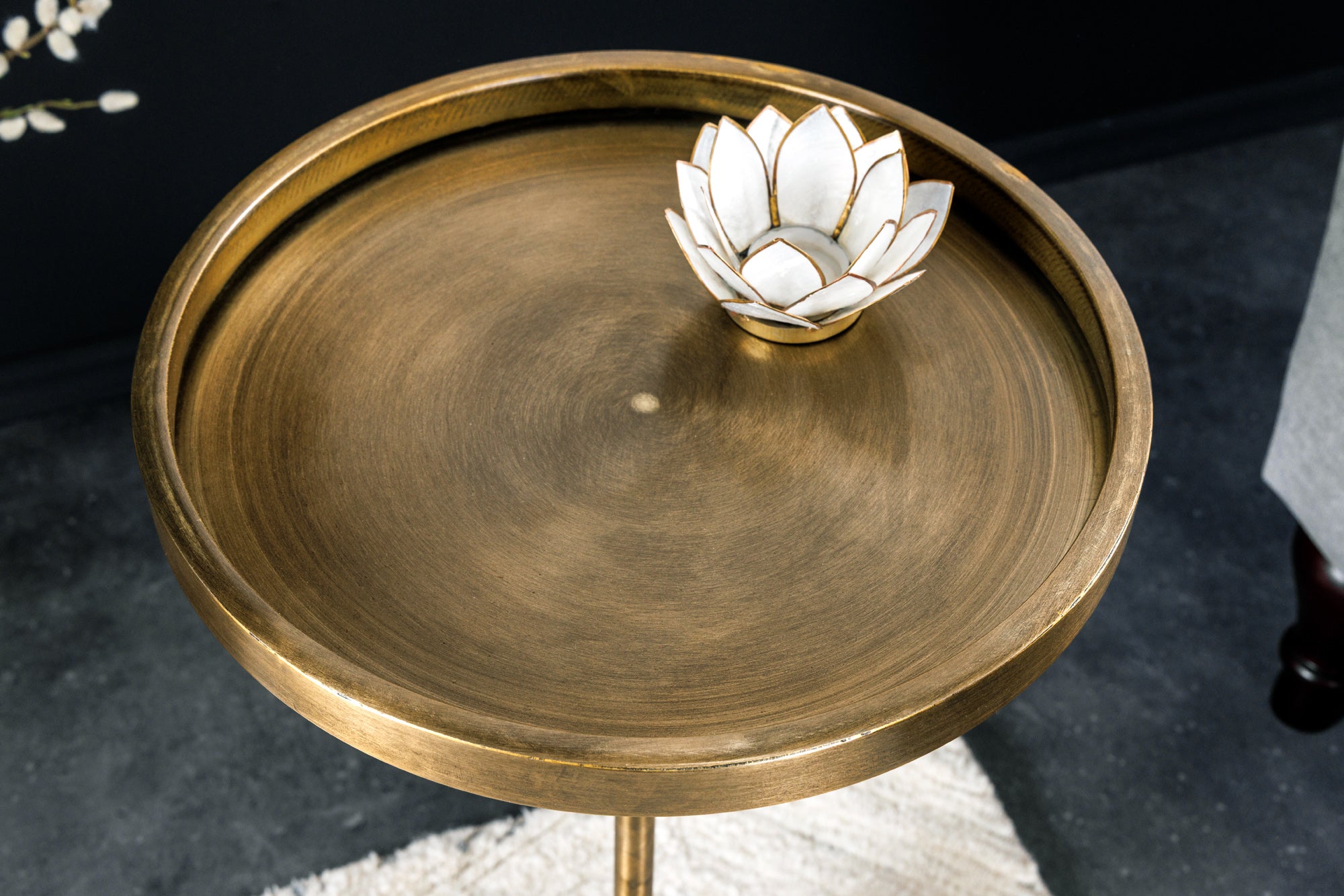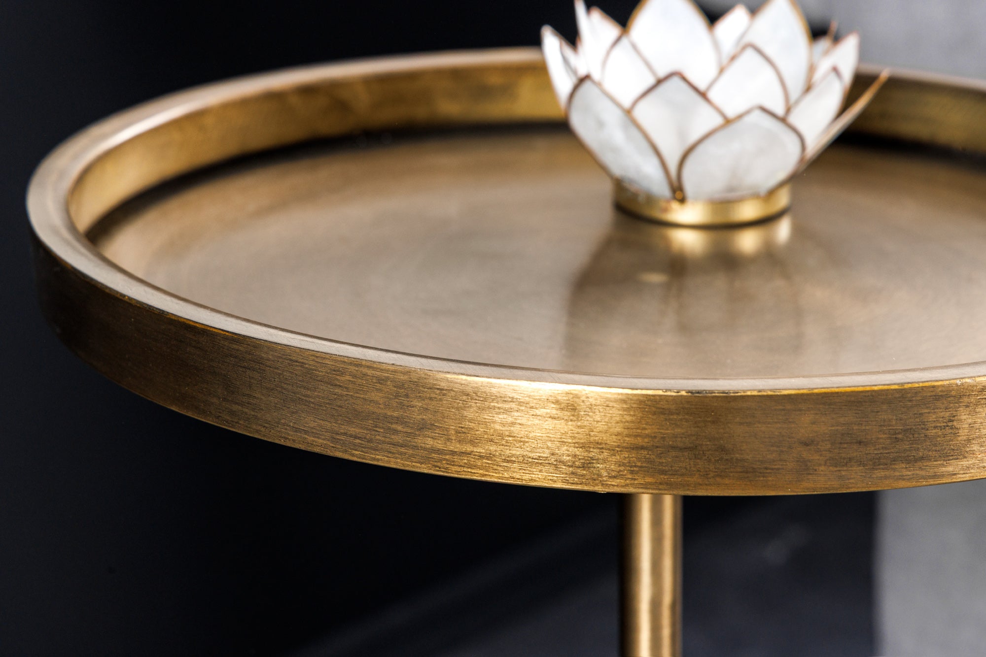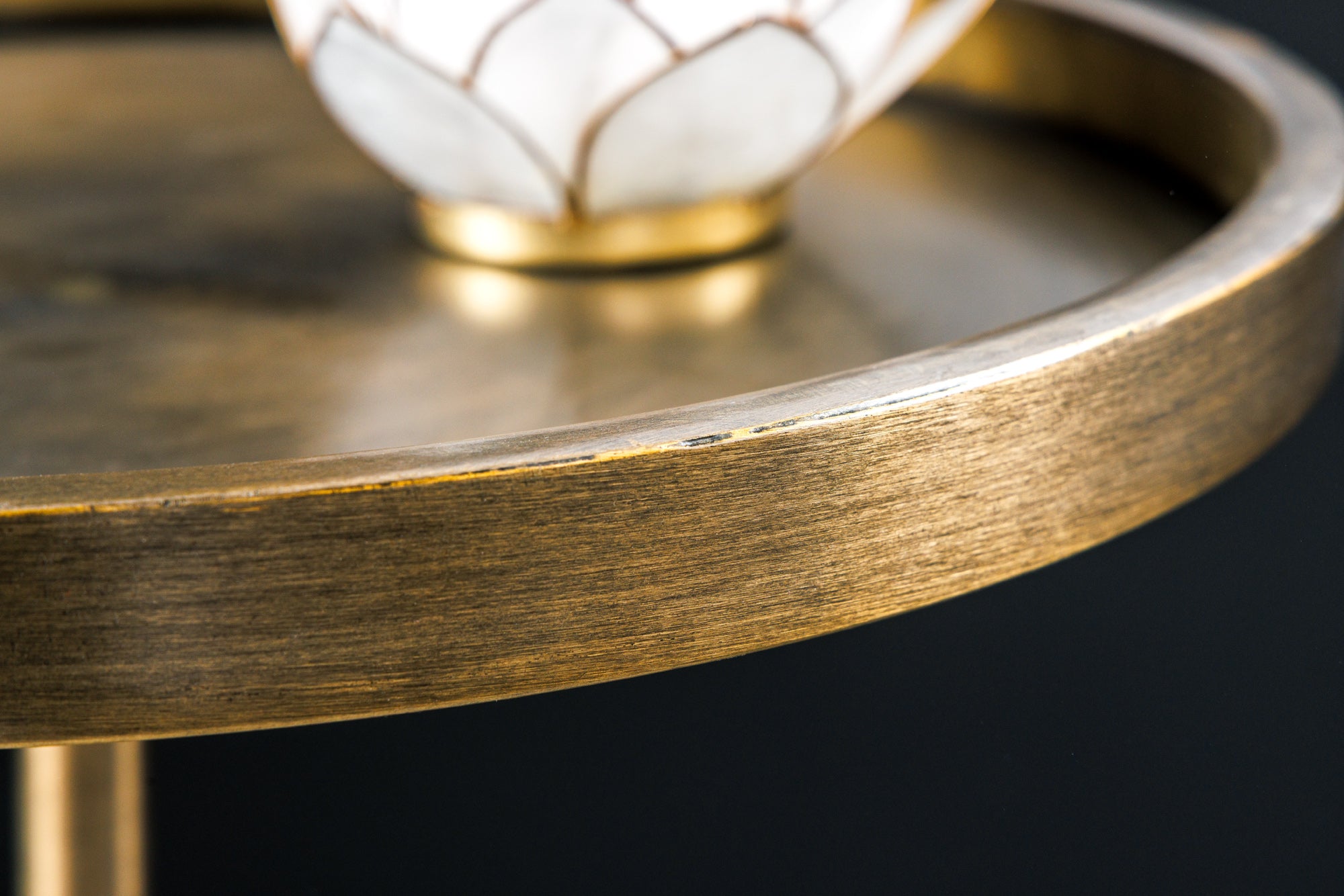 Stylowy stolik boczny marki Invicta Interior, który łączy dekoracyjną podstawę o marmurowym wyglądzie z metalowym blatem w wykończeniu antique brass. Forma tacy nadaje meblowi elegancji i zwiększa funkcjonalność — drobne przedmioty pozostają stabilnie na powierzchni.