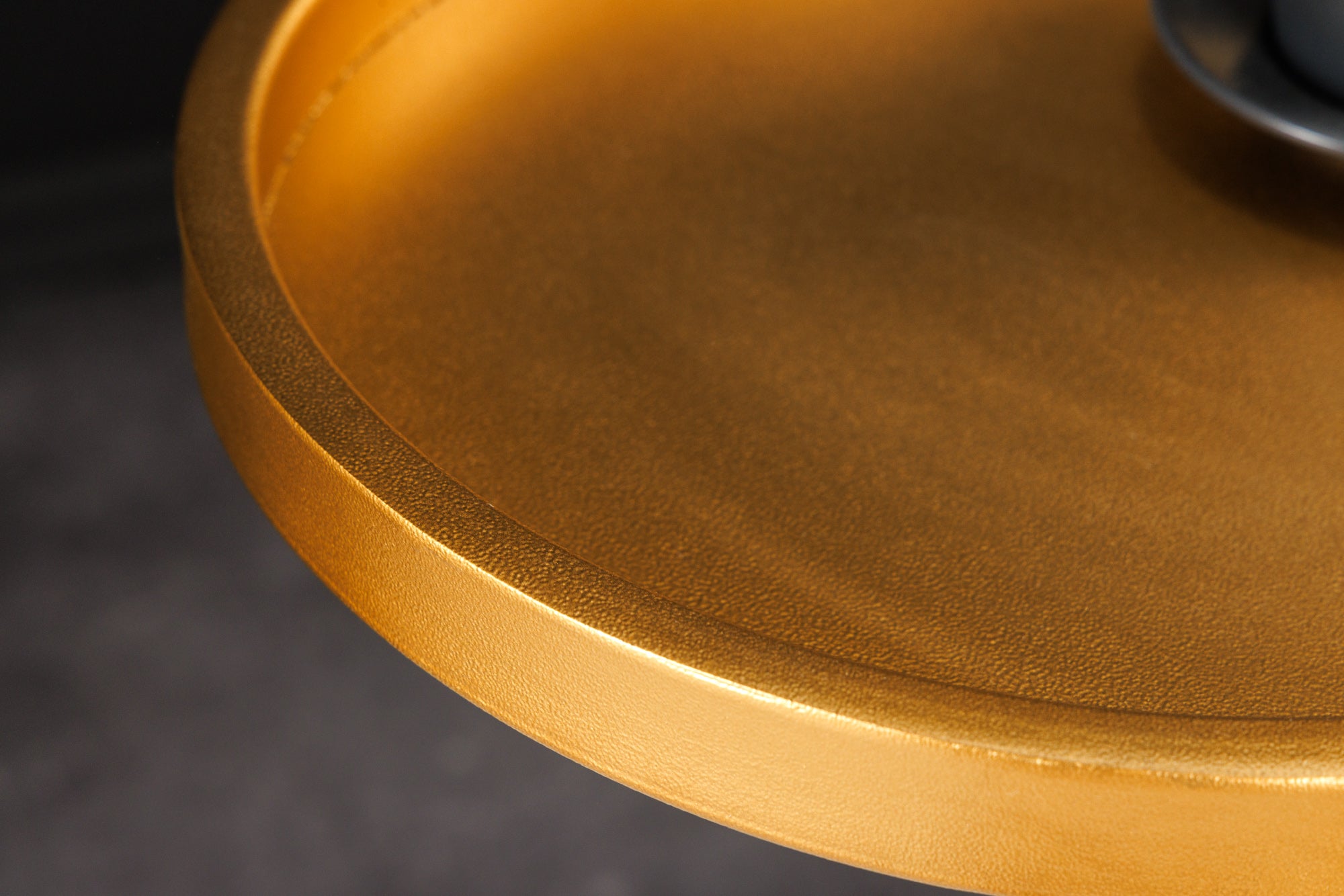 Elegancki stolik boczny marki Invicta Interior, który łączy dekoracyjną, metalową konstrukcję w złotym odcieniu z podstawą o wyglądzie szarego marmuru. Blat w formie tacy nadaje meblowi lekkości i jednocześnie zwiększa jego funkcjonalność, zapobiegając zsuwaniu się przedmiotów.