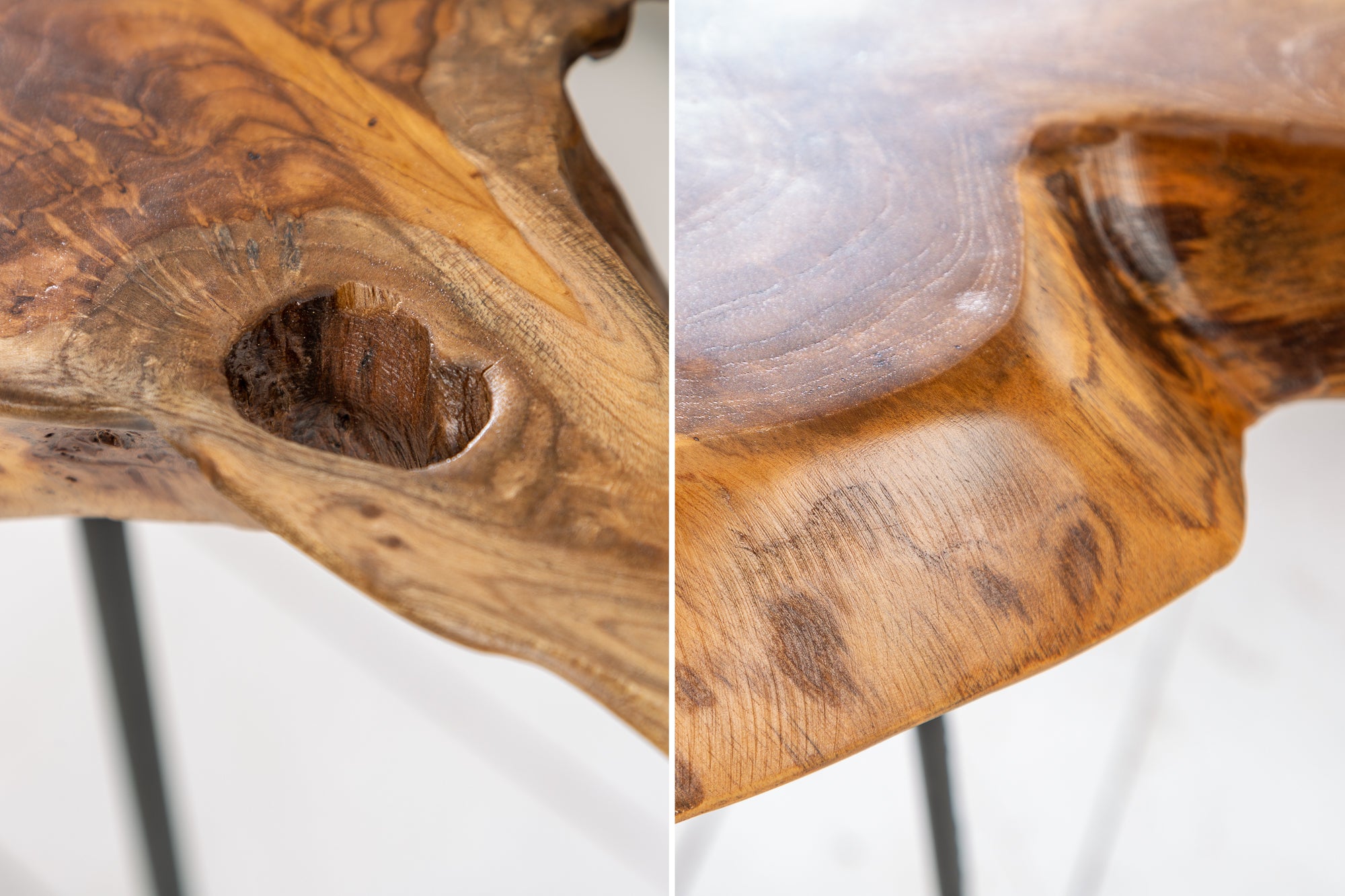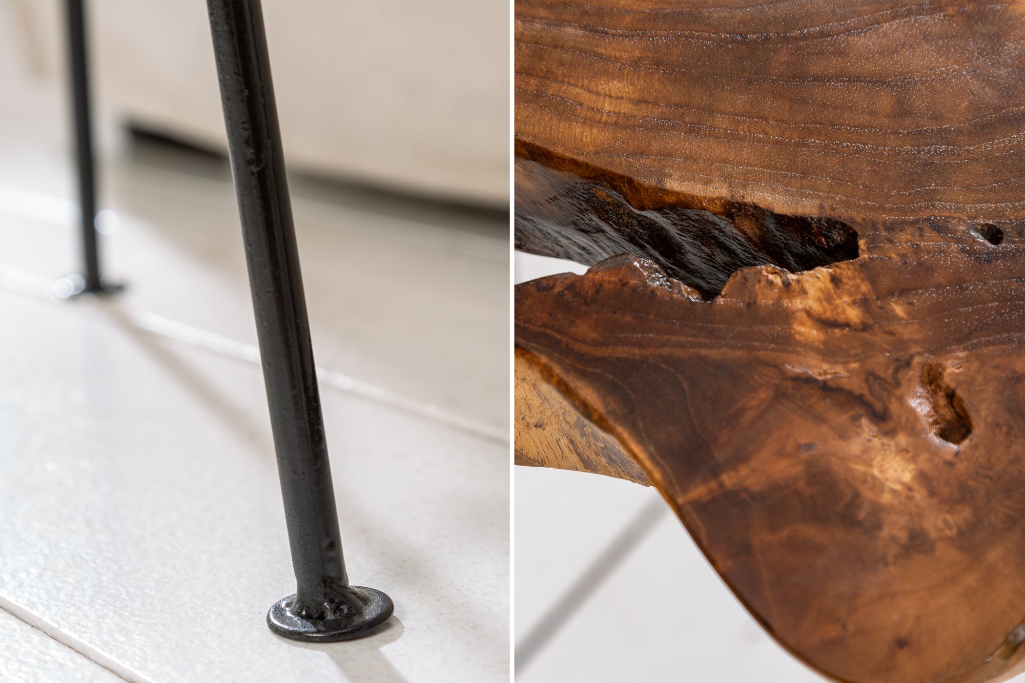 Wyjątkowy stolik boczny, który łączy naturalne piękno drewna teak z lekką, metalową konstrukcją. Blat o organicznym kształcie zachowuje naturalne krawędzie drzewa, dzięki czemu każdy egzemplarz wygląda inaczej i wprowadza do wnętrza autentyczny, surowy klimat.