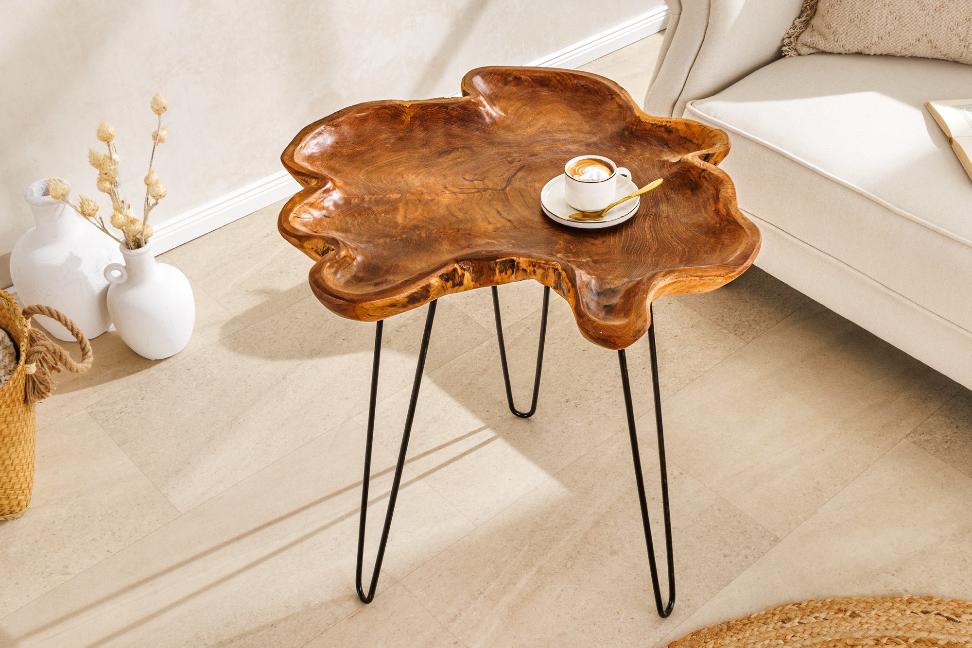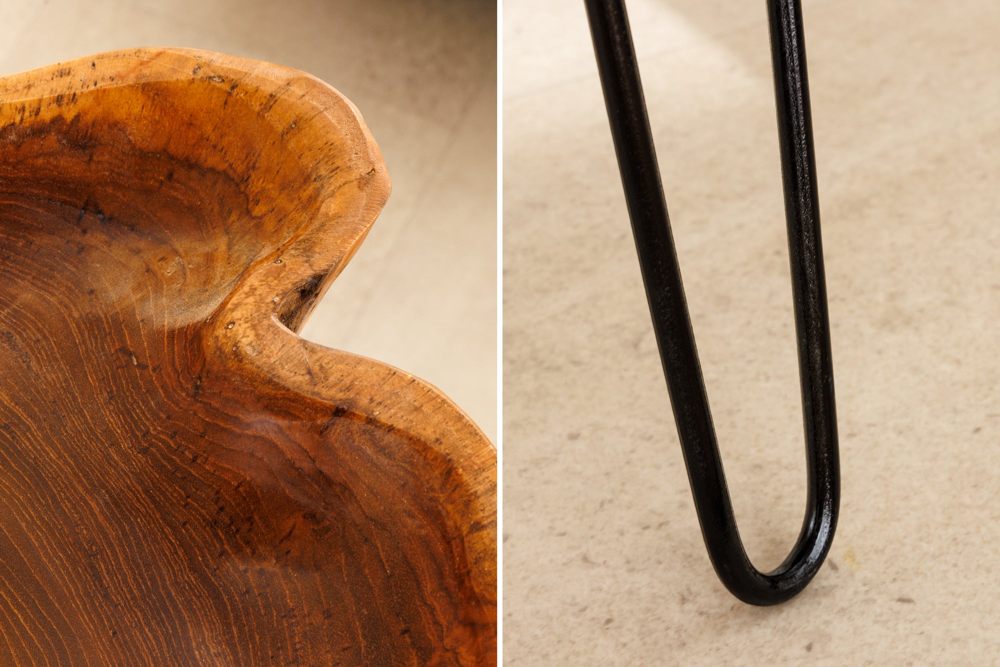 Stylowy stolik boczny marki Invicta Interior, wykonany z naturalnego drewna tekowego o ciepłej barwie i widocznym usłojeniu. Lekka konstrukcja na czarnych metalowych nogach typu hairpin nadaje meblowi nowoczesny, a jednocześnie inspirowany stylem mid-century charakter.
