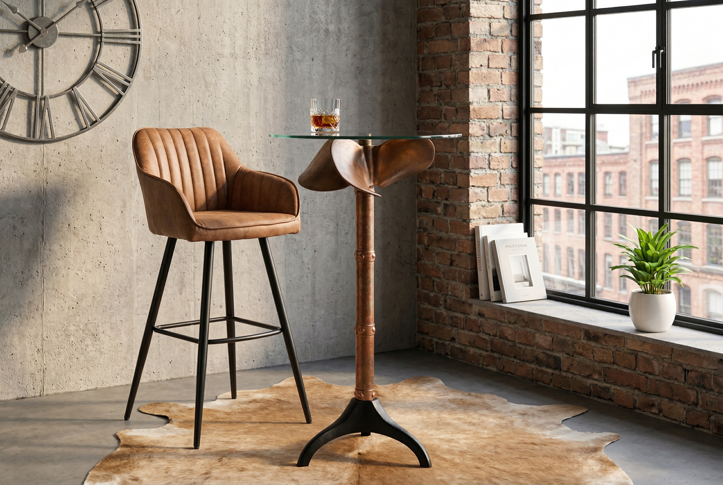 Najbardziej charakterystycznym elementem mebla jest metalowa podstawa w kolorze miedzianym, zaprojektowana na kształt dużej śruby napędowej statku. Ten niezwykły detal sprawia, że stół staje się centralnym elementem aranżacji wnętrza i przyciąga uwagę swoim unikalnym stylem. Połączenie transparentnego szkła z metalową konstrukcją tworzy nowoczesny, elegancki efekt, który doskonale pasuje do wnętrz industrialnych, nowoczesnych oraz loftowych.