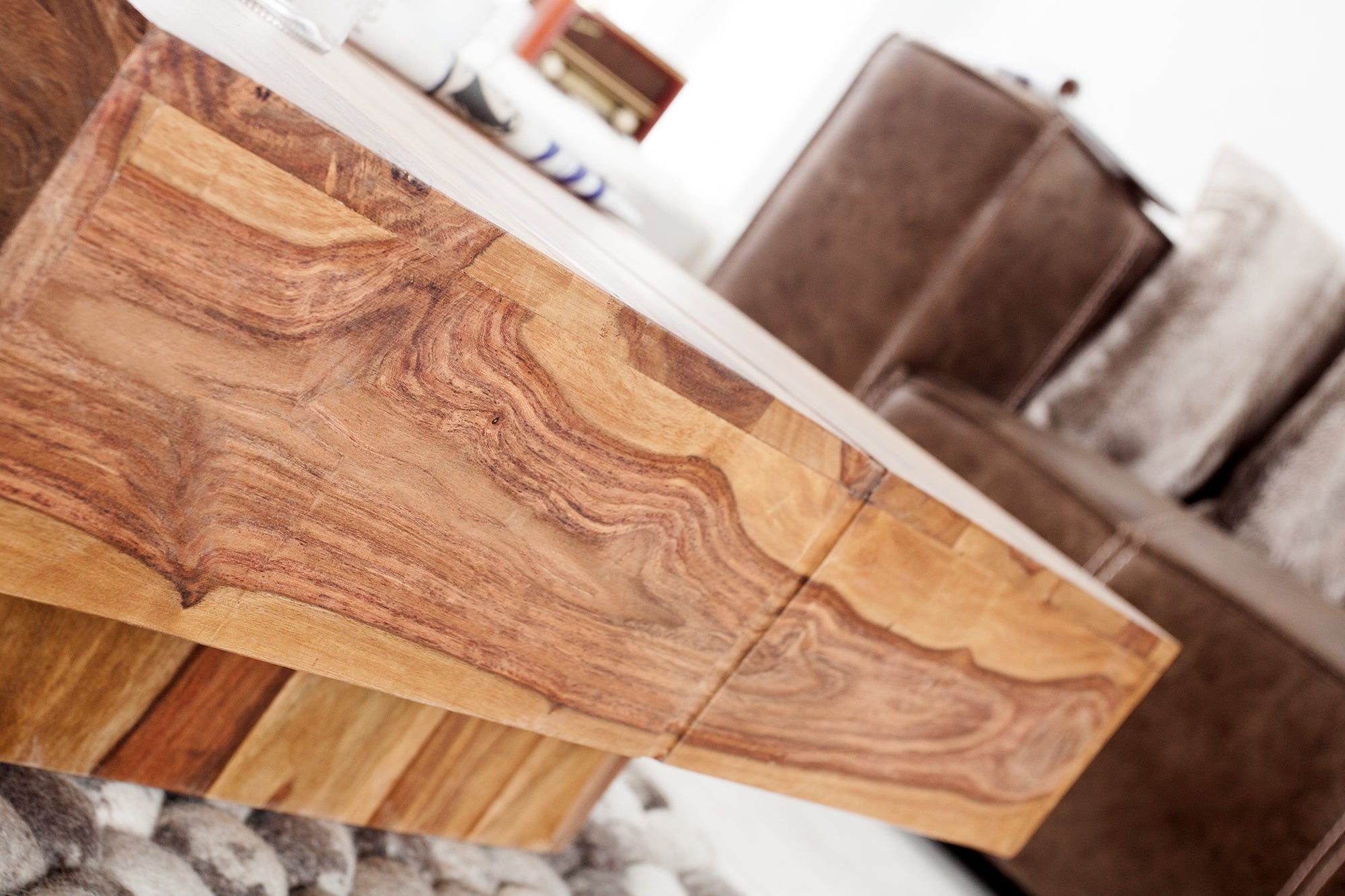 Drewno sheesham jest materiałem naturalnym, dlatego każdy stolik może różnić się kolorem, strukturą oraz układem słojów. Mogą występować sęki, drobne pęknięcia czy różnice odcieni – są to naturalne cechy drewna i podkreślają jego autentyczność.