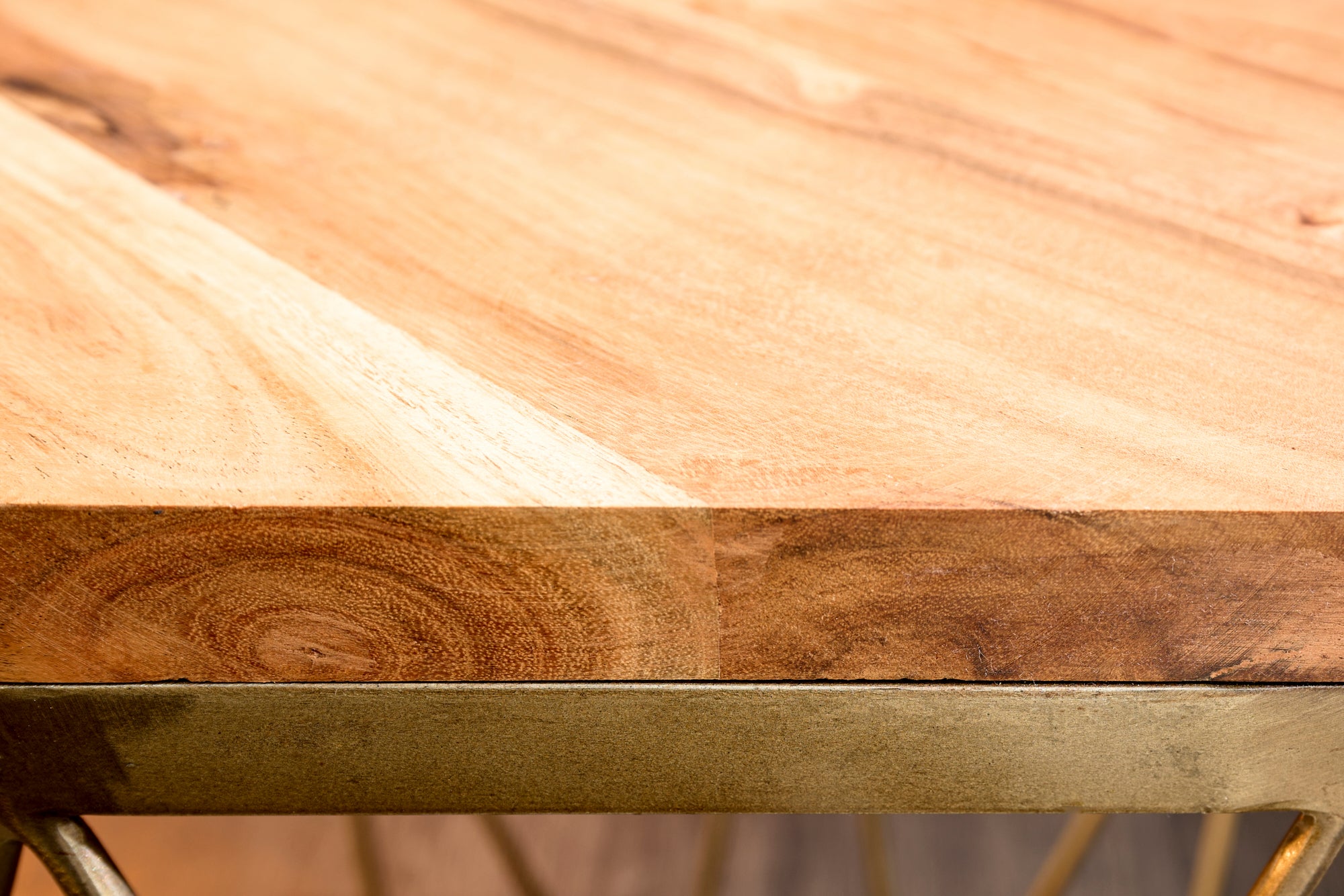 Kompaktowy stolik kawowy marki Invicta Interior z blatem z litego drewna akacjowego oraz dekoracyjną metalową podstawą w kolorze mosiądzu. Naturalna struktura drewna w połączeniu z ciepłym odcieniem metalu tworzy elegancki, ale przytulny charakter pasujący do wnętrz nowoczesnych i loftowych.