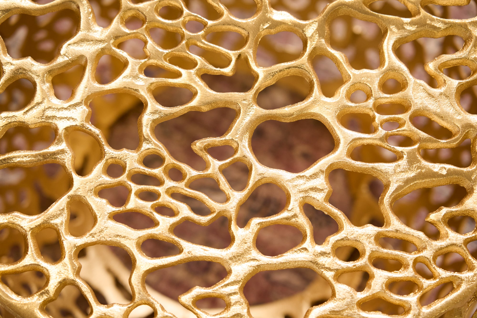 Dekoracyjny stolik kawowy marki Invicta Interior inspirowany kształtem liścia. Złote wykończenie oraz rzeźbiarska forma nadają meblowi elegancki i wyrazisty charakter, dzięki czemu pełni zarówno funkcję użytkową, jak i ozdobną.