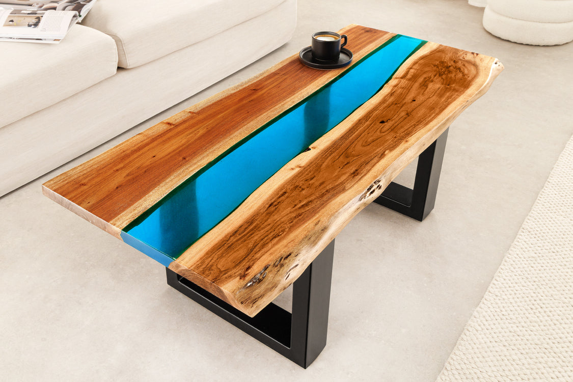 Unikalny stolik kawowy marki Invicta Interior, który łączy naturalne piękno drewna akacjowego z efektownym pasem żywicy epoksydowej w intensywnym odcieniu niebieskiego. Połączenie organicznej struktury drewna z nowoczesnym akcentem kolorystycznym tworzy mebel o artystycznym charakterze, który przyciąga wzrok i wnosi do wnętrza niepowtarzalny styl.