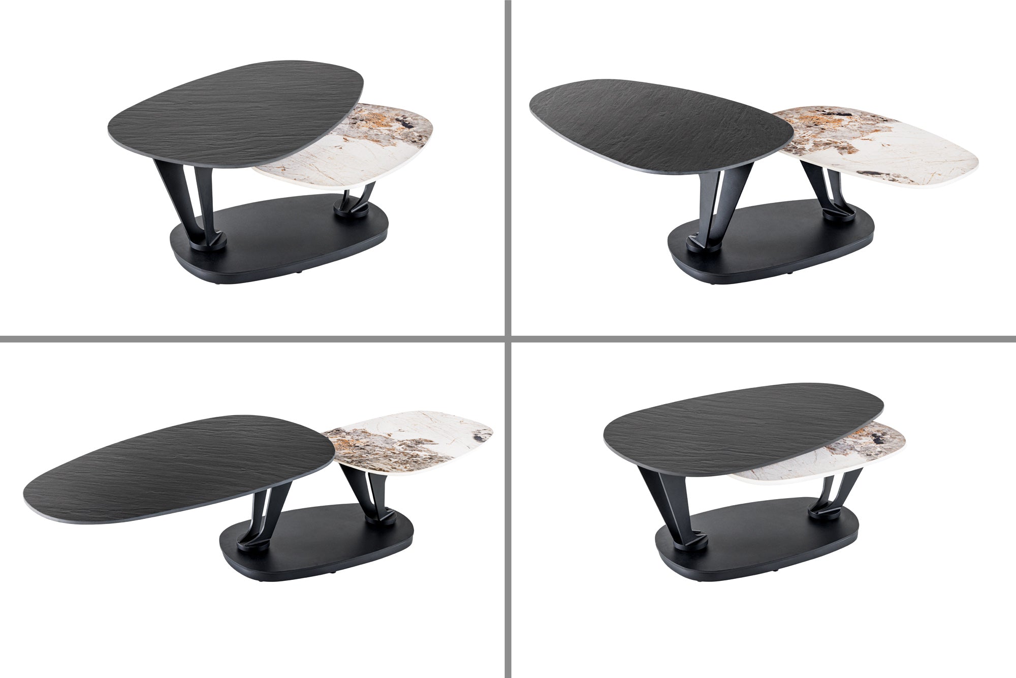 Nowoczesny stolik kawowy marki Invicta Interior z rozsuwaną konstrukcją pozwalającą zmieniać wielkość blatu. Połączenie czarnej ceramiki z powierzchnią o wyglądzie naturalnego kamienia nadaje meblowi elegancki i designerski charakter.