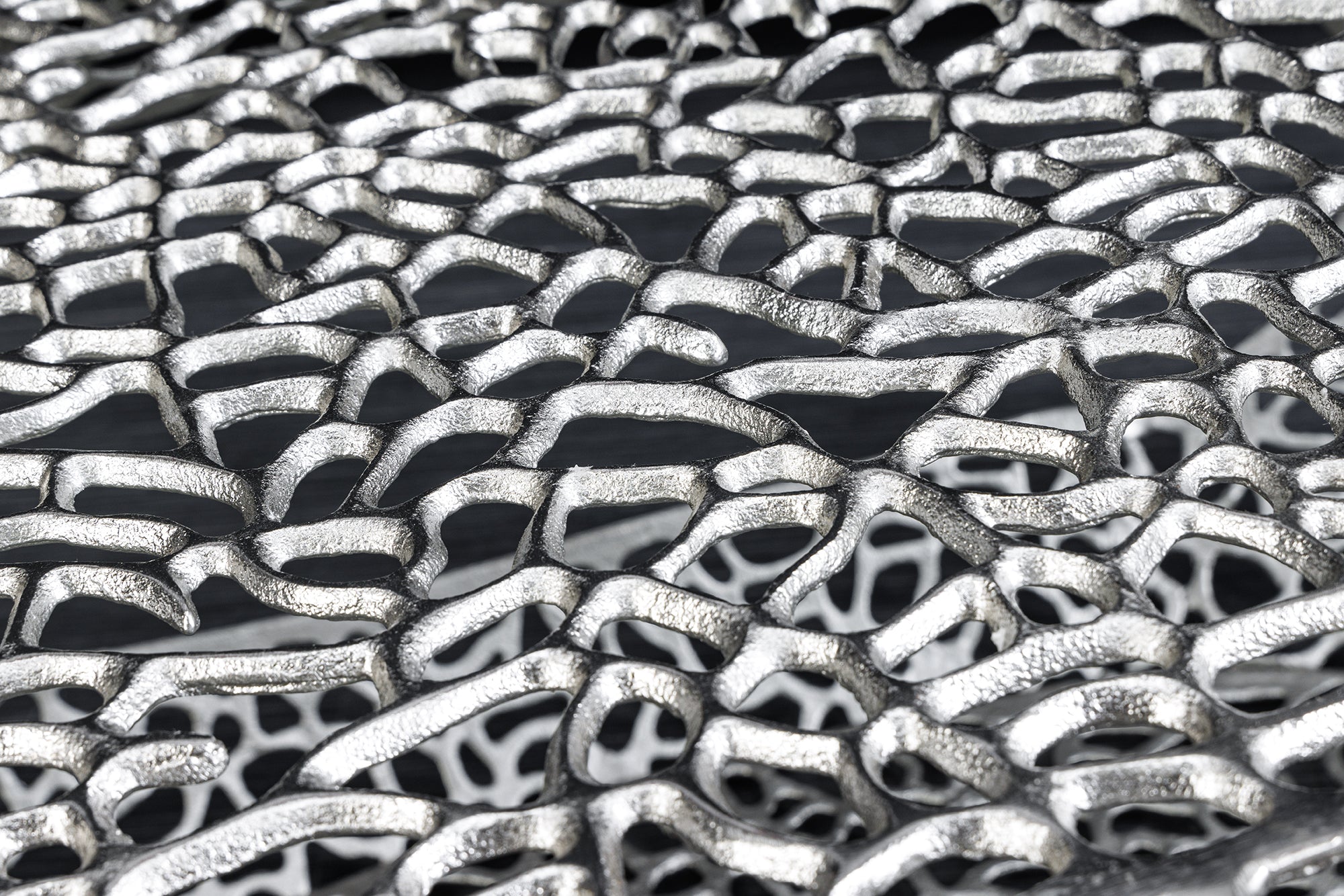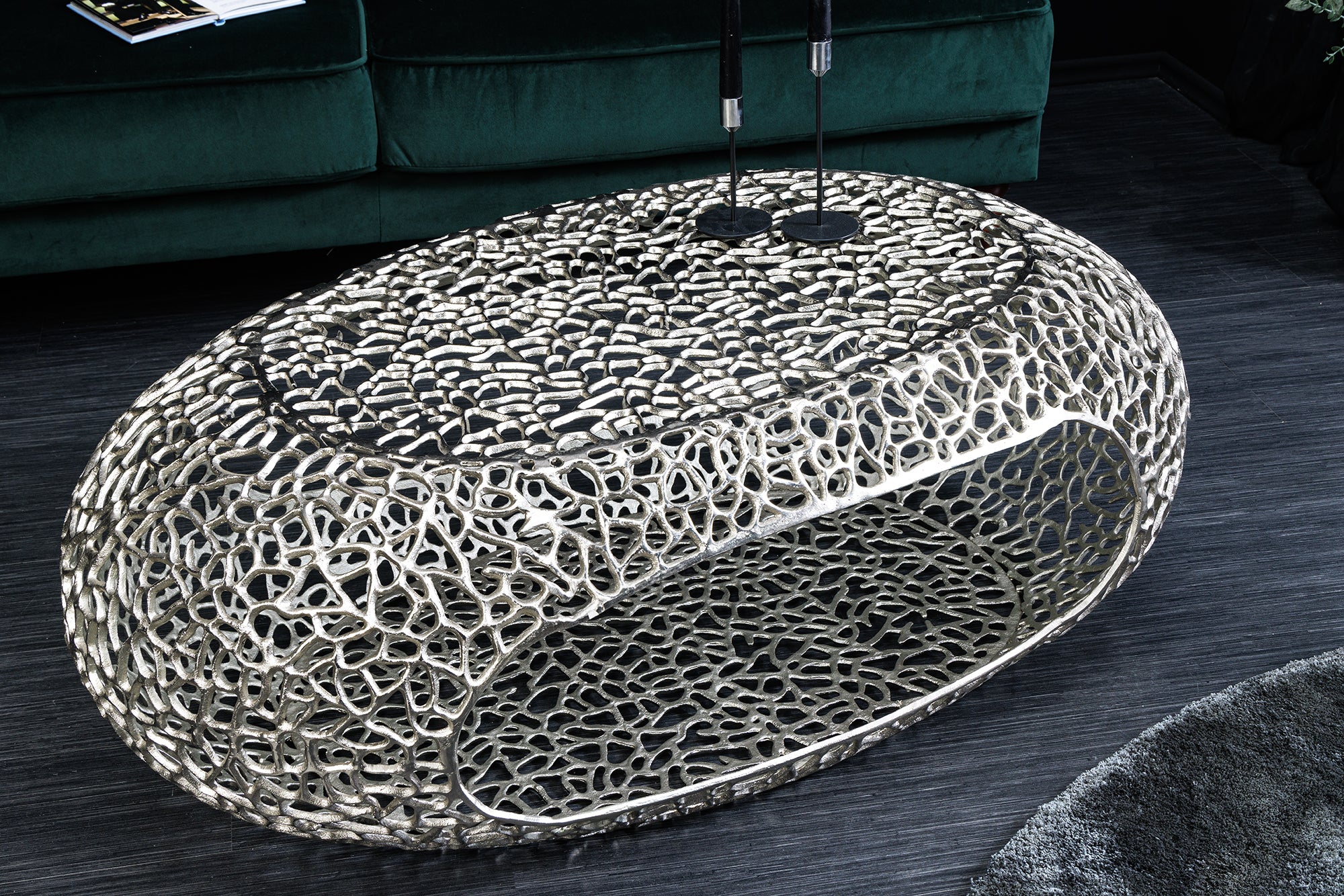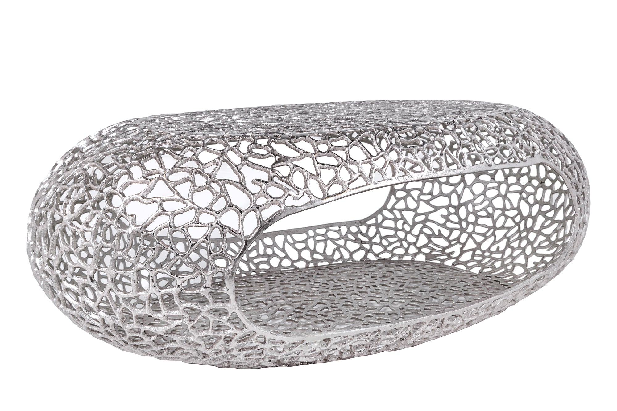 Dekoracyjny stolik kawowy marki Invicta Interior o organicznym, nieregularnym kształcie. Całość utrzymana w srebrnym wykończeniu tworzy efekt rzeźbiarskiego elementu wyposażenia, który pełni zarówno funkcję użytkową, jak i ozdobną.