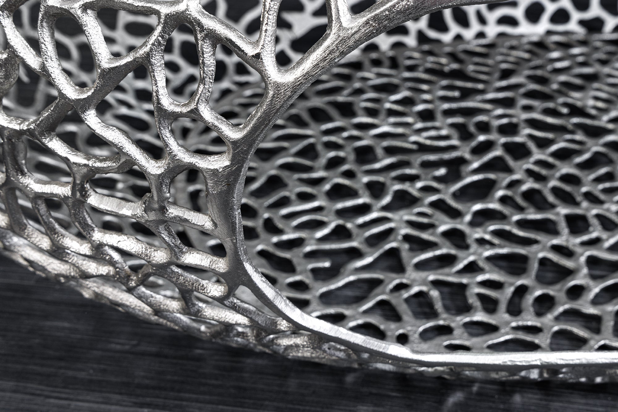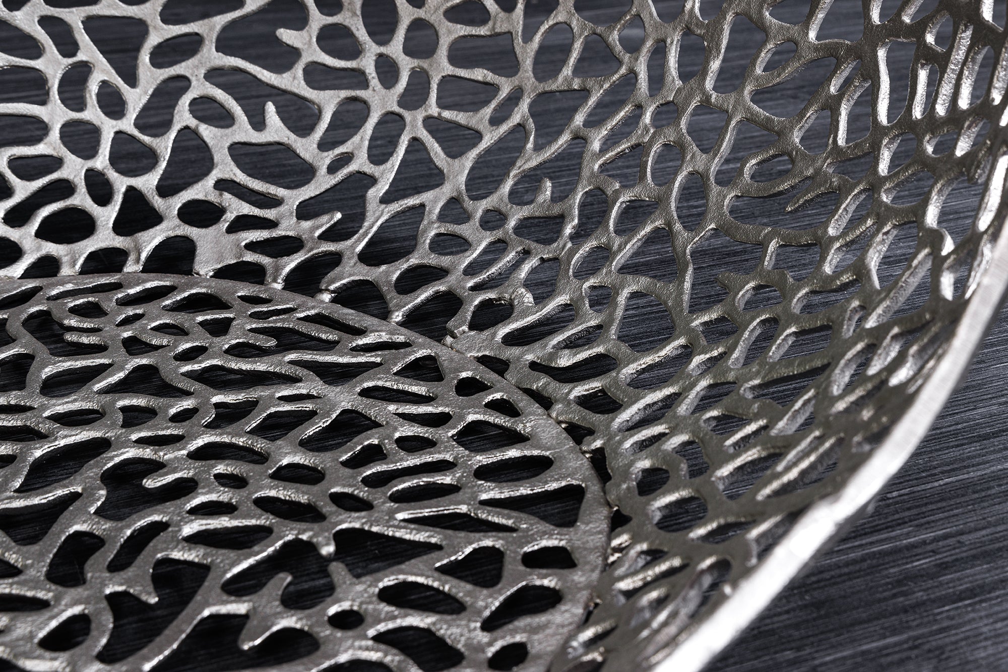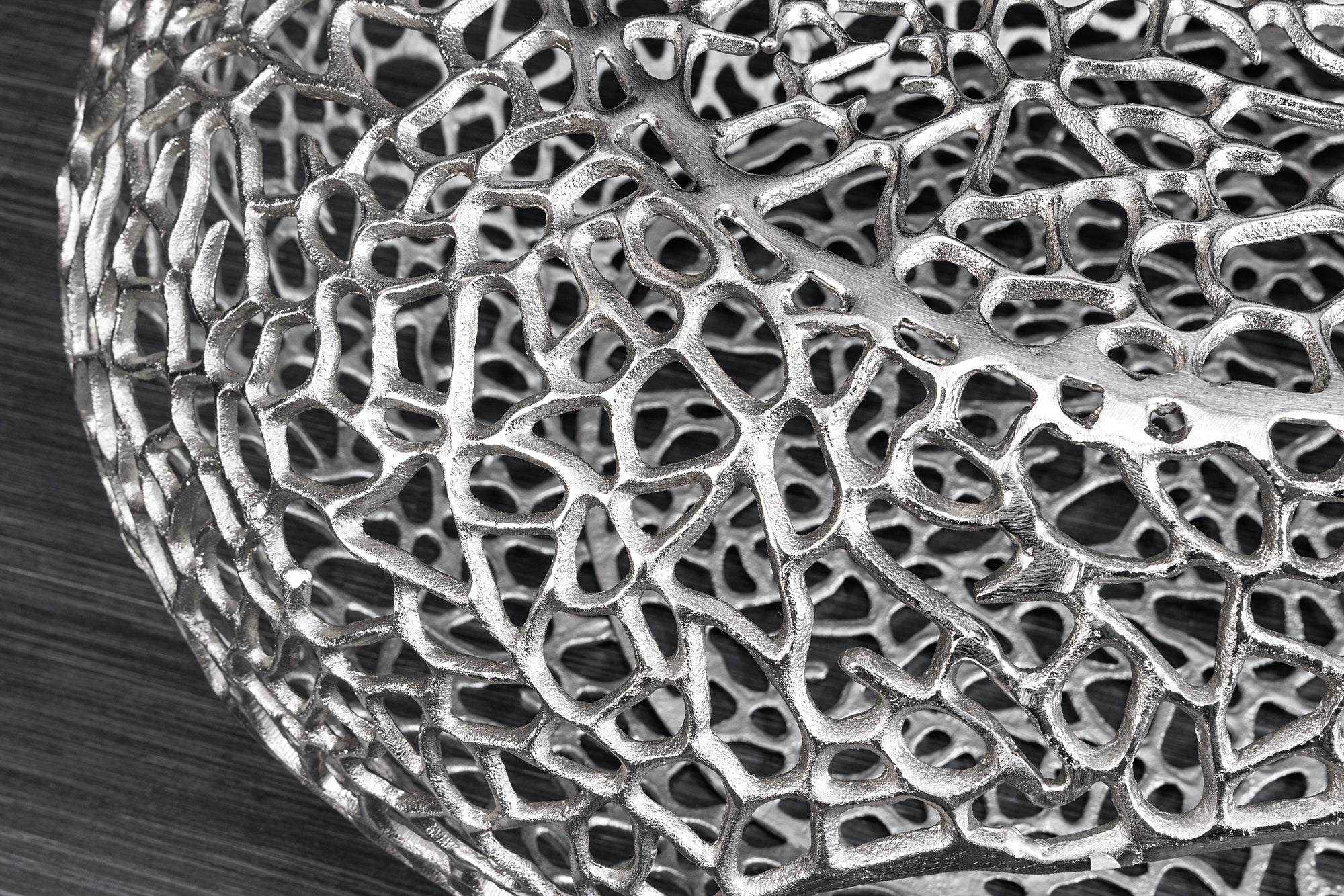 Dekoracyjny stolik kawowy marki Invicta Interior o organicznym, nieregularnym kształcie. Całość utrzymana w srebrnym wykończeniu tworzy efekt rzeźbiarskiego elementu wyposażenia, który pełni zarówno funkcję użytkową, jak i ozdobną.