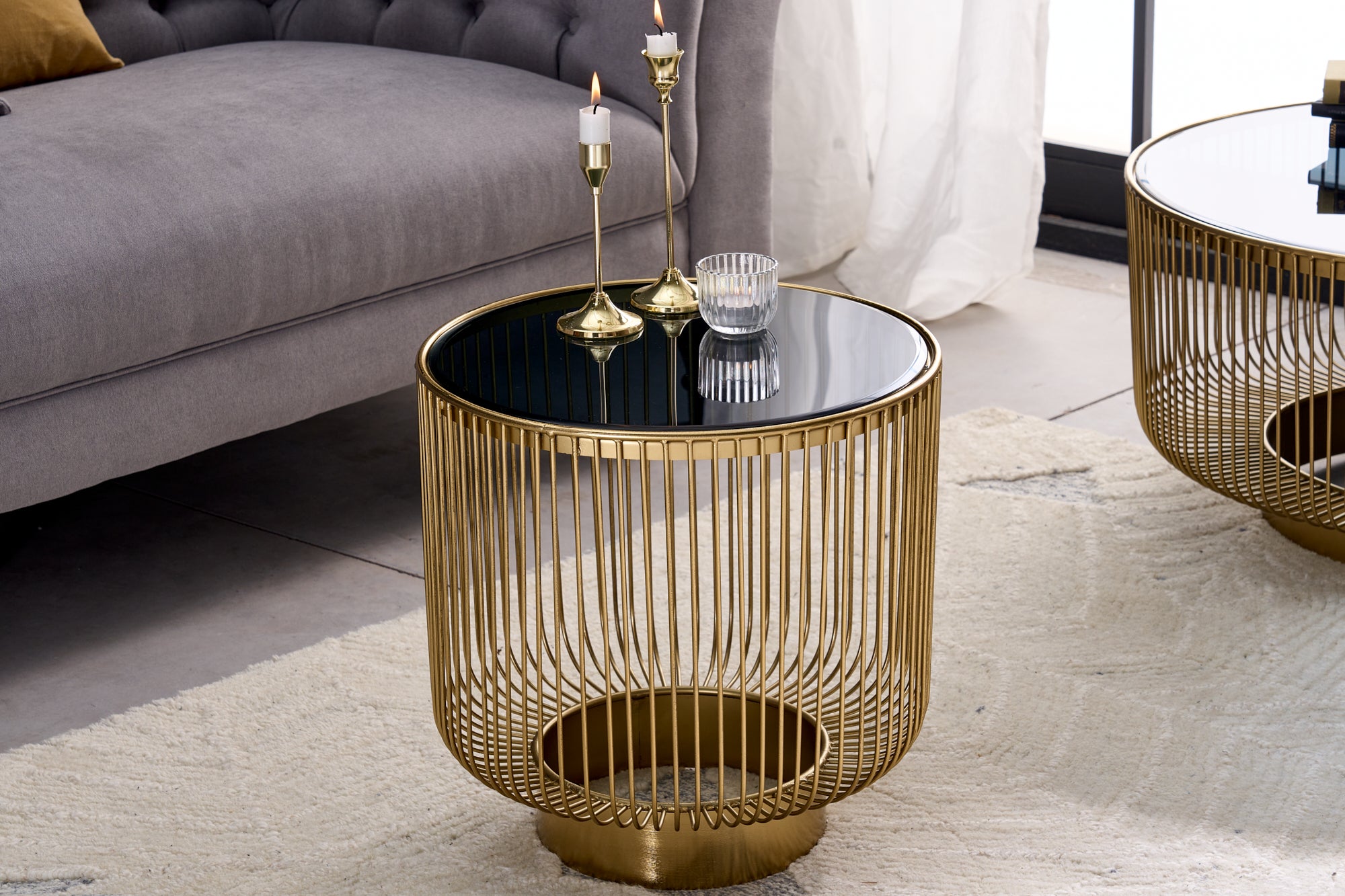 Kompaktowy stolik kawowy marki Invicta Interior o eleganckiej, dekoracyjnej formie. Złota konstrukcja zestawiona z blatem z czarnego szkła tworzy kontrastowy akcent pasujący do wnętrz glamour i nowoczesnych aranżacji.