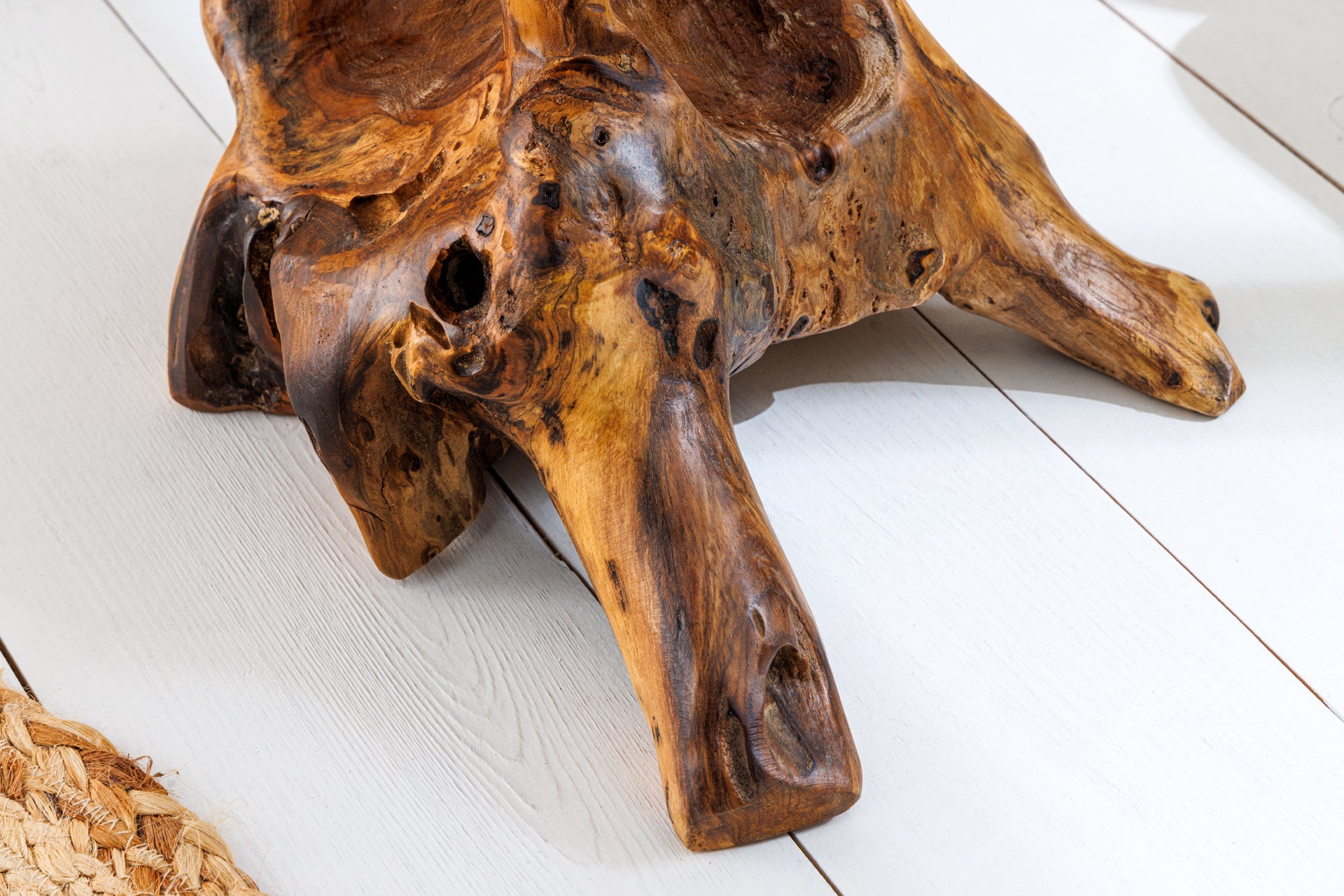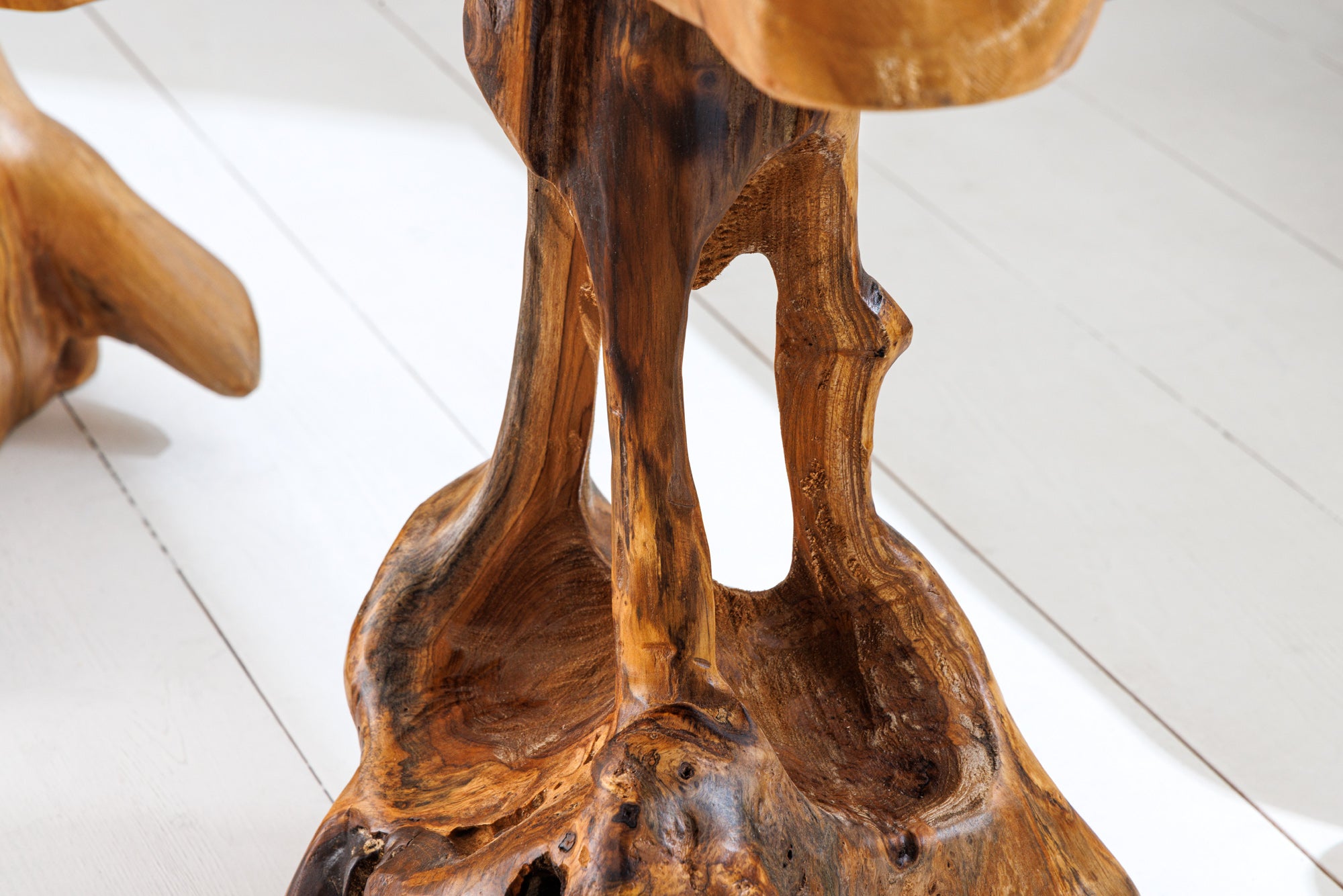 Wyjątkowy stolik pomocniczy wykonany z litego drewna teakowego pochodzącego z korzenia drzewa. Naturalna struktura drewna sprawia, że każdy egzemplarz posiada niepowtarzalny kształt, usłojenie oraz kolorystykę. Dzięki temu stolik pełni nie tylko funkcję praktyczną, ale również dekoracyjną, wprowadzając do wnętrza element natury.