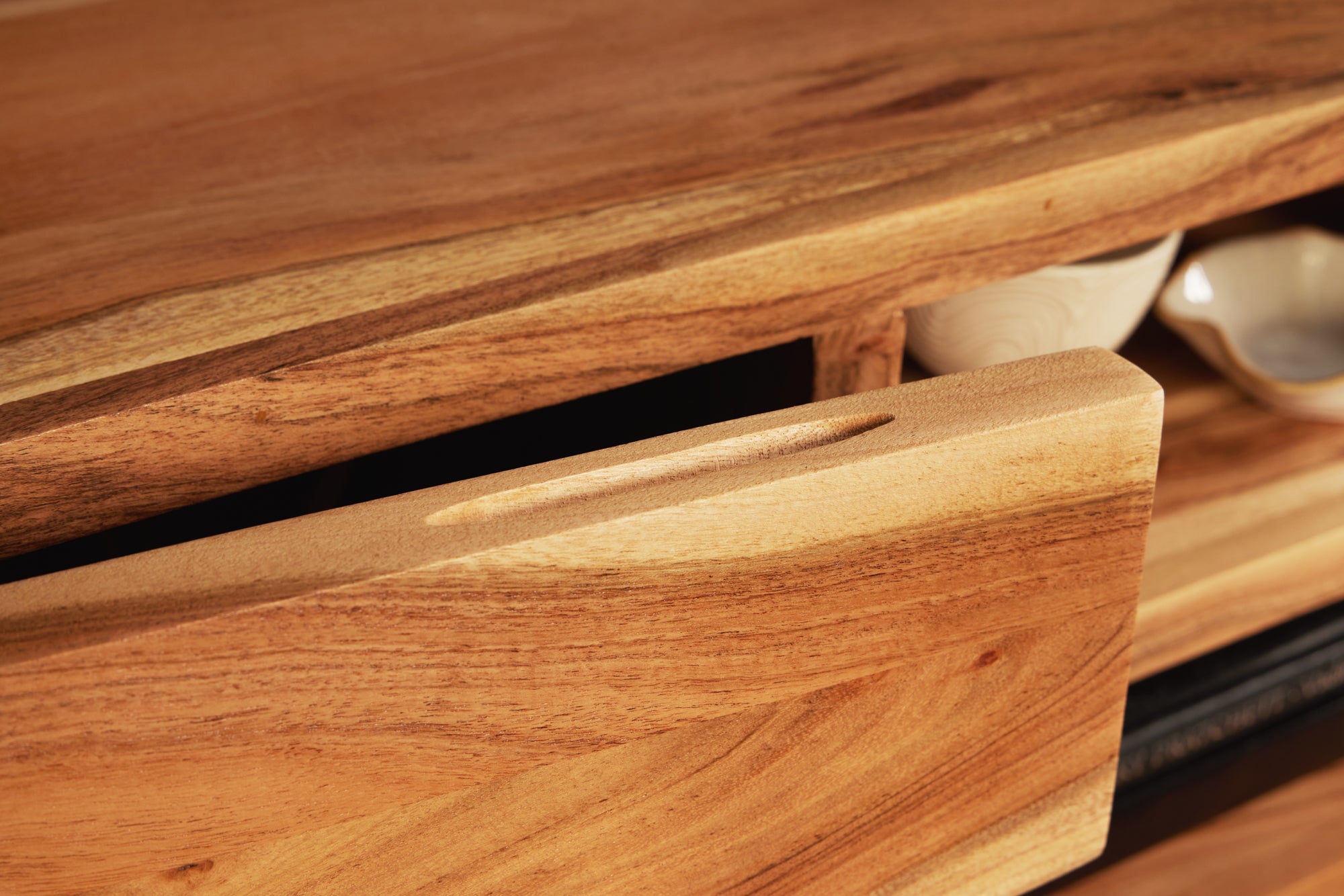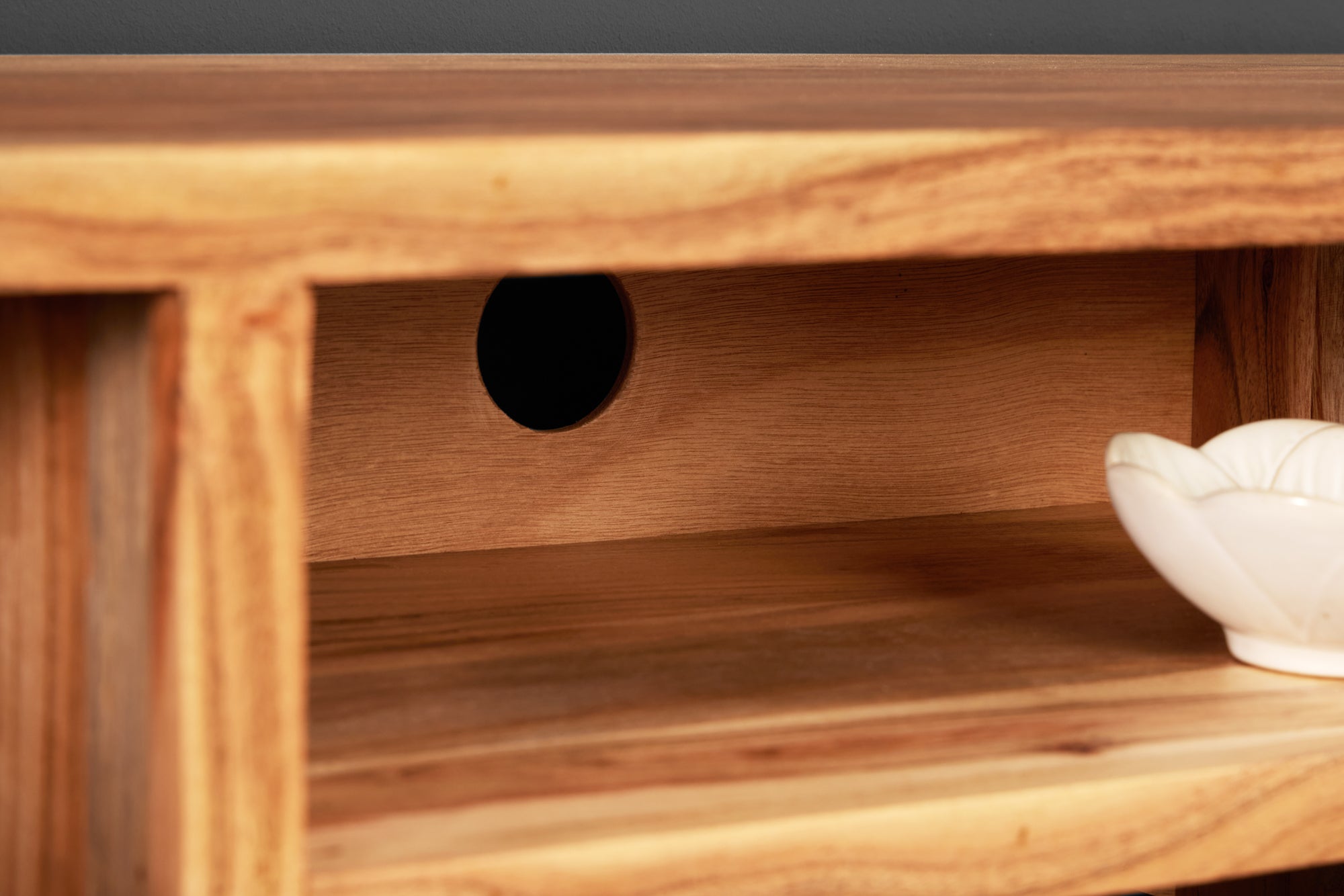 Nowoczesna, wisząca szafka RTV o naturalnym i wyrazistym charakterze, wykonana z litego drewna akacji. Model AMAZONAS wyróżnia się pięknym, naturalnym usłojeniem oraz subtelnymi metalowymi detalami, które nadają meblowi industrialny wygląd.