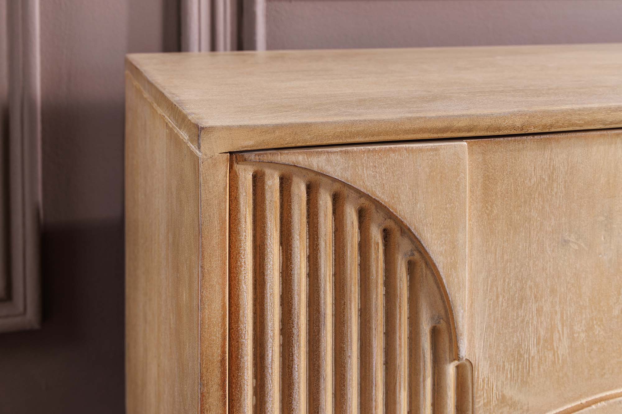 Nowoczesna i niezwykle efektowna szafka RTV wykonana z litego drewna mango w jasnym, bielonym wykończeniu. Fronty zdobione są charakterystycznym wzorem 3D o geometrycznej strukturze, który nadaje meblowi rzeźbiarski wygląd i sprawia, że staje się centralnym punktem salonu.