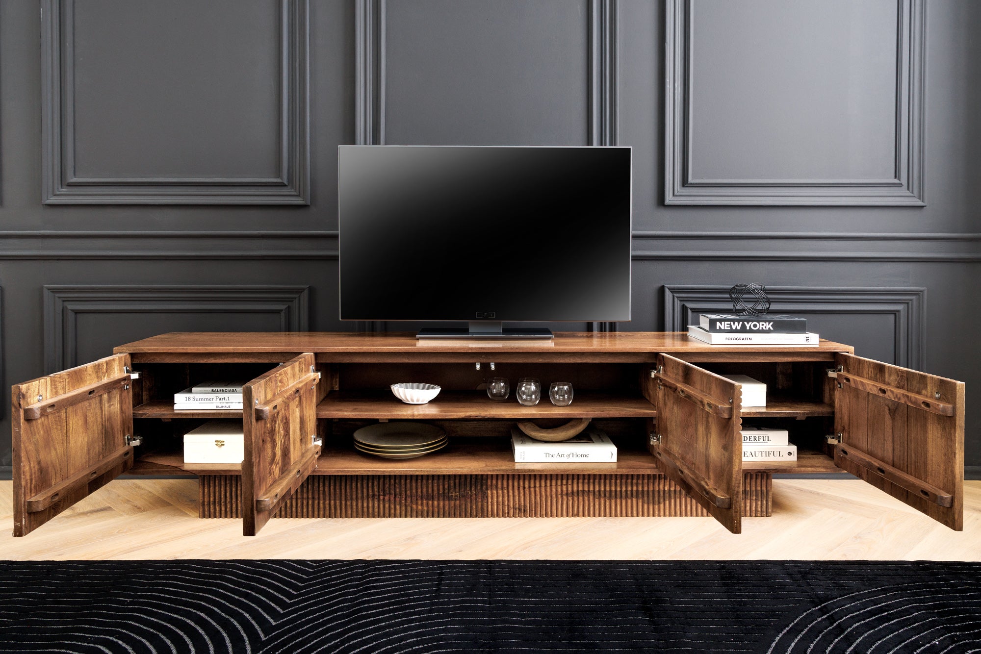 Nowoczesna i bardzo efektowna szafka RTV wykonana z litego drewna mango w głębokim, ciepłym odcieniu smoked brown. Fronty zdobione są charakterystycznym wzorem 3D o geometrycznej strukturze, który tworzy rzeźbiarski efekt i pięknie załamuje światło, nadając meblowi wyjątkowy charakter.