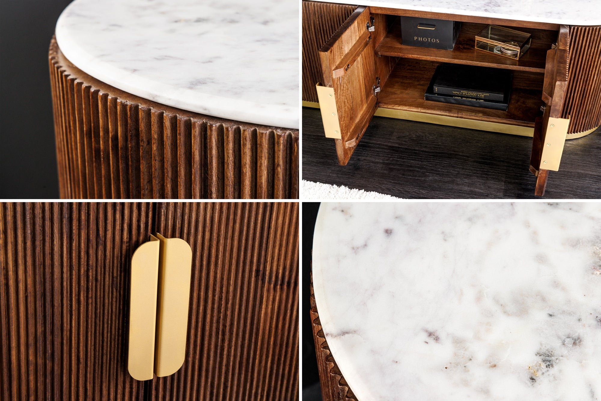 Luksusowa szafka RTV o wyrazistym charakterze, łącząca naturalne drewno mango z eleganckim marmurowym blatem oraz złotymi detalami. Model GATSBY to połączenie stylu retro i glamour – idealny wybór do wnętrz, gdzie mebel ma być nie tylko funkcjonalny, ale też dekoracyjny.