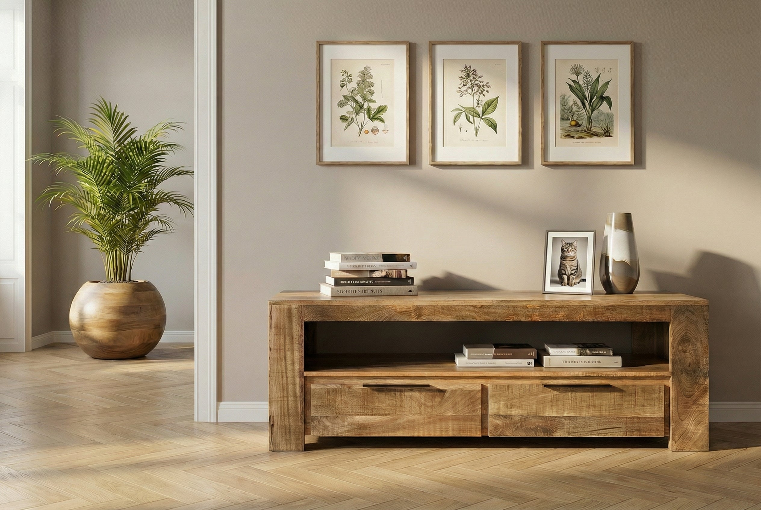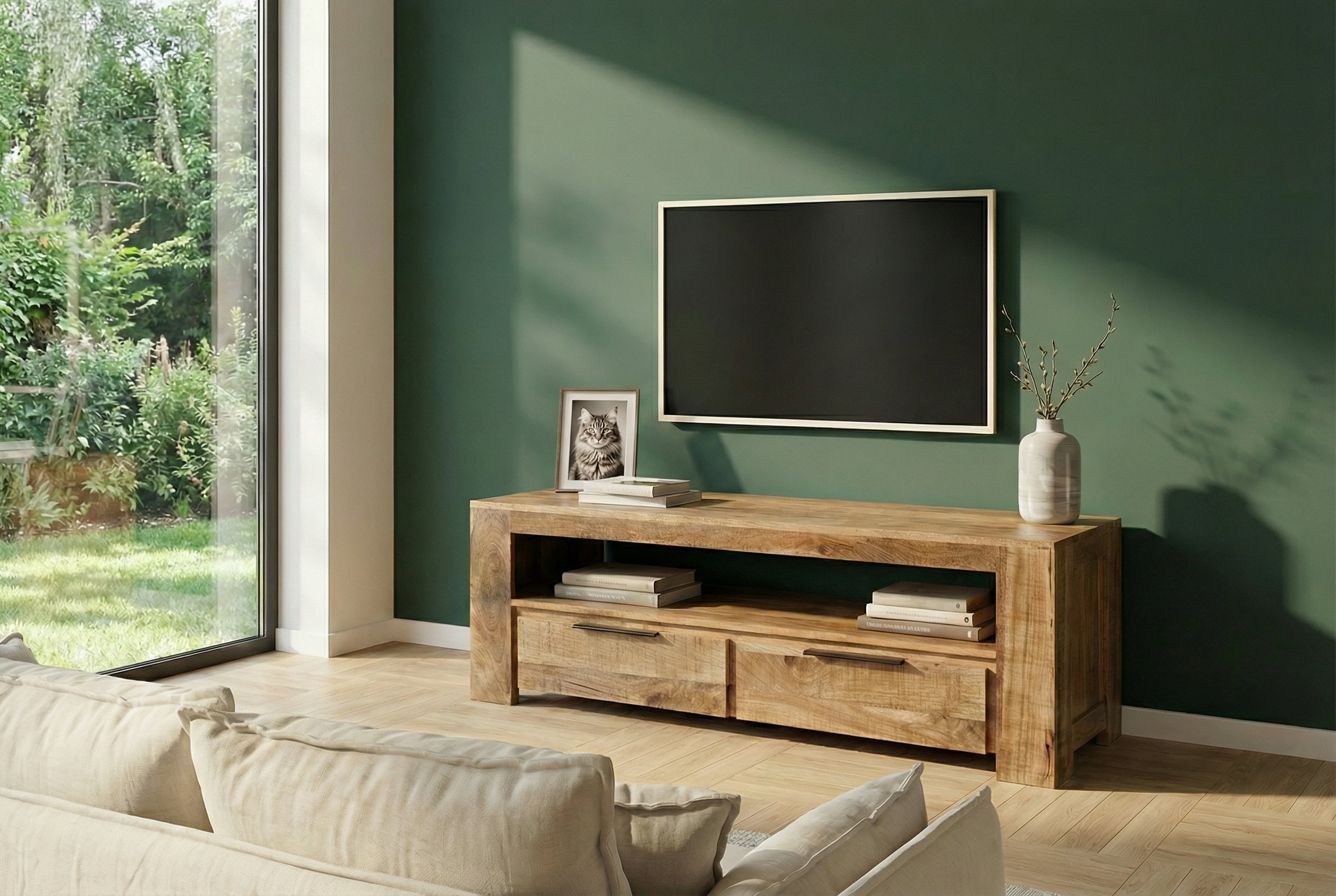 Szafka RTV IRON CRAFT 130 cm to solidny, industrialny mebel wykonany z litego drewna mango, który wyróżnia się surowym, naturalnym wyglądem i prostą, funkcjonalną formą. Naturalne drewno z widocznymi sękami i przetarciami nadaje mu autentyczny charakter i sprawia, że każdy egzemplarz wygląda inaczej.